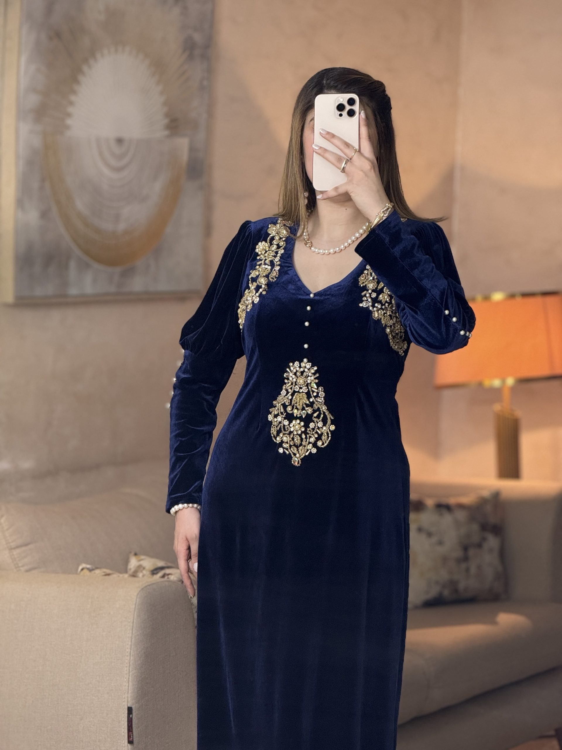 فستان راقٍ مُصمَّم بالبرلاج الحُرّ، يتميز بتوزيع دقيق للتطريز على الأكتاف وفي منتصف الفستان ليمنح مظهراً فخماً ومتوازناً. يأتي مع حزام خلفي يُبرز الخصر ويضيف لمسة أنثوية ناعمة