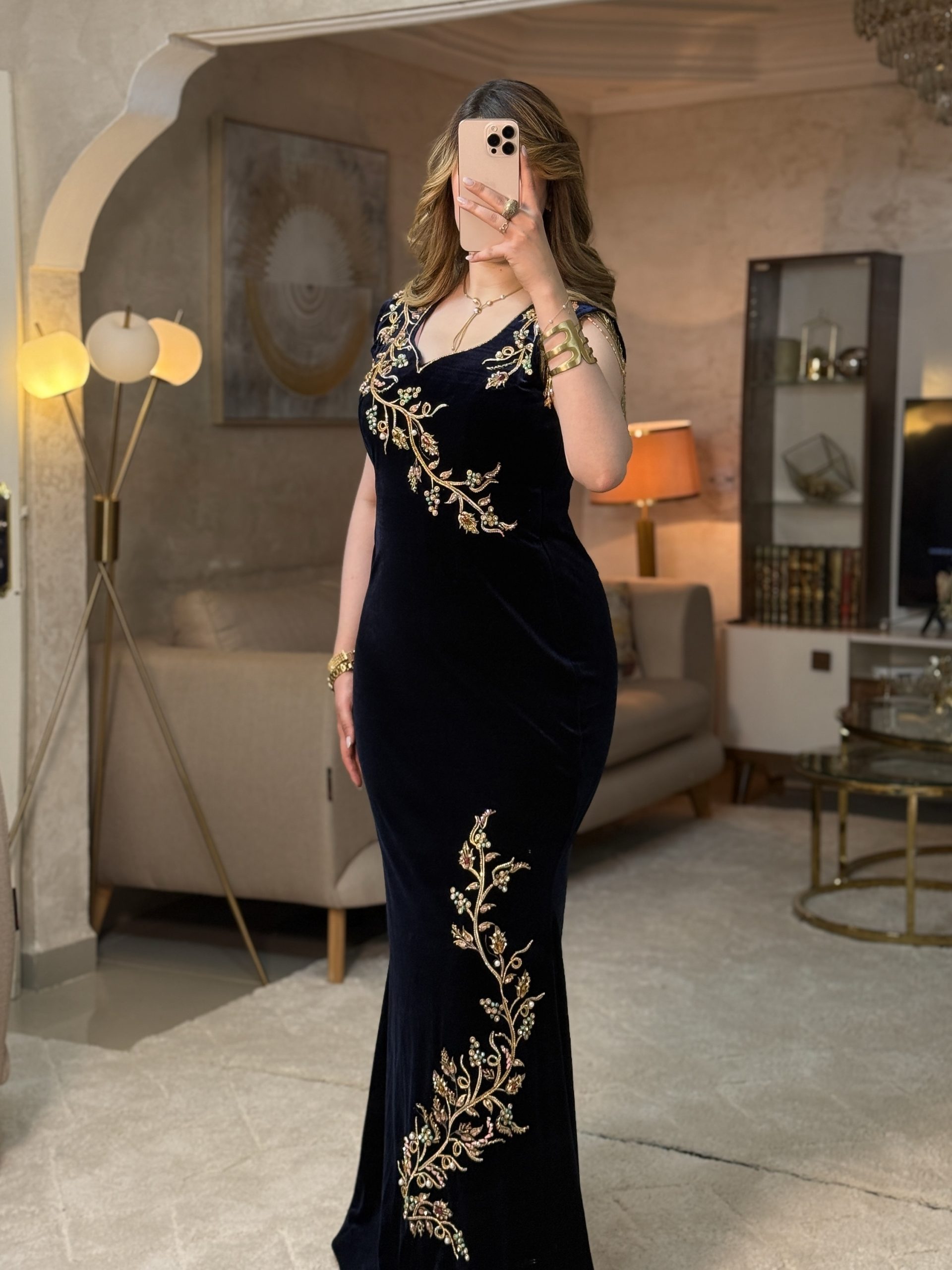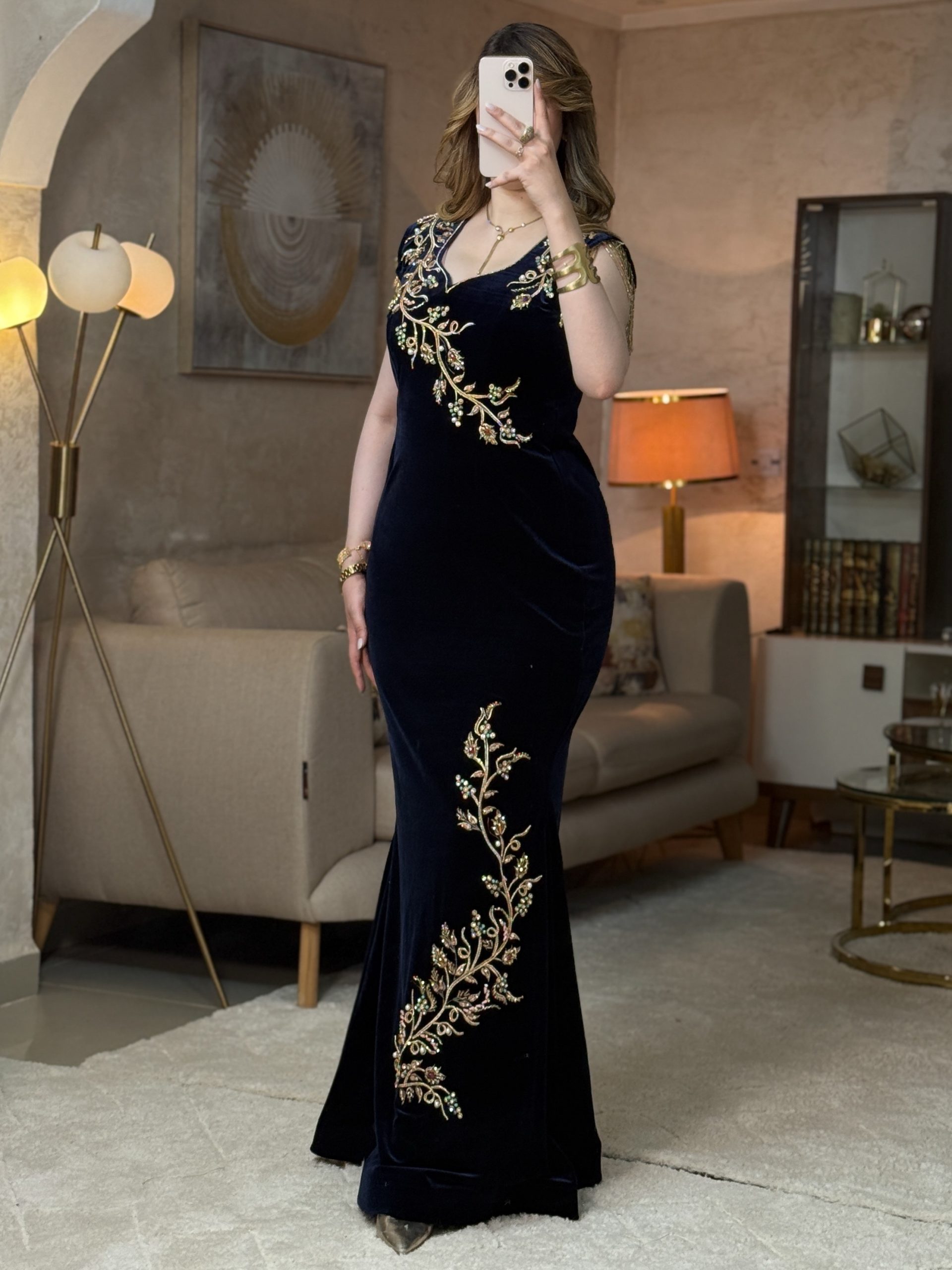 فستان مصمّم بقصّة ضيّقة على شكل حورية تُبرز جمال القوام بانسيابية راقية. يتميز بلمسة فاخرة عند الكتفين بسلاسل من البرلاج تضيف بريقًا ناعمًا وحضورًا أنيقًا.