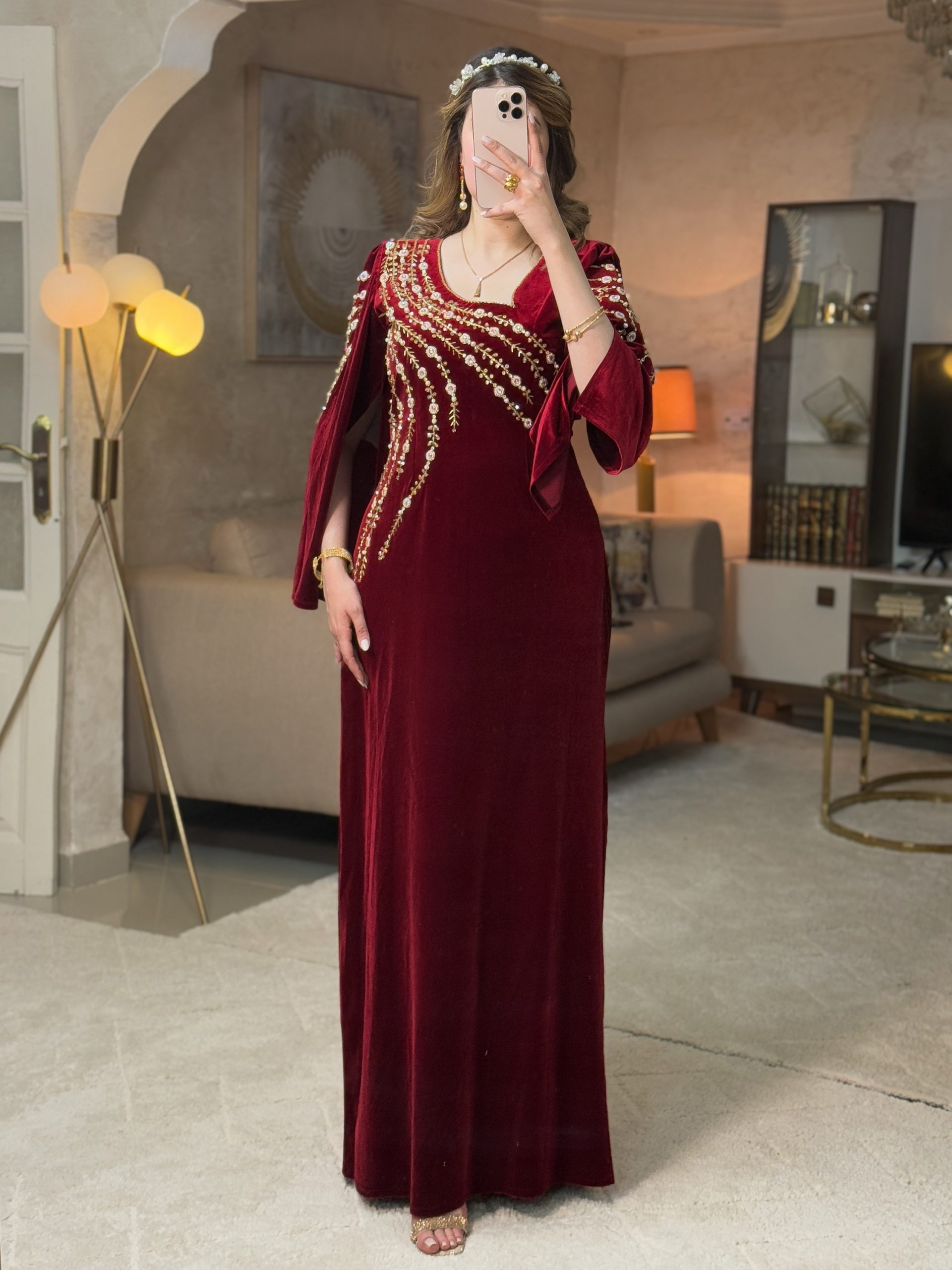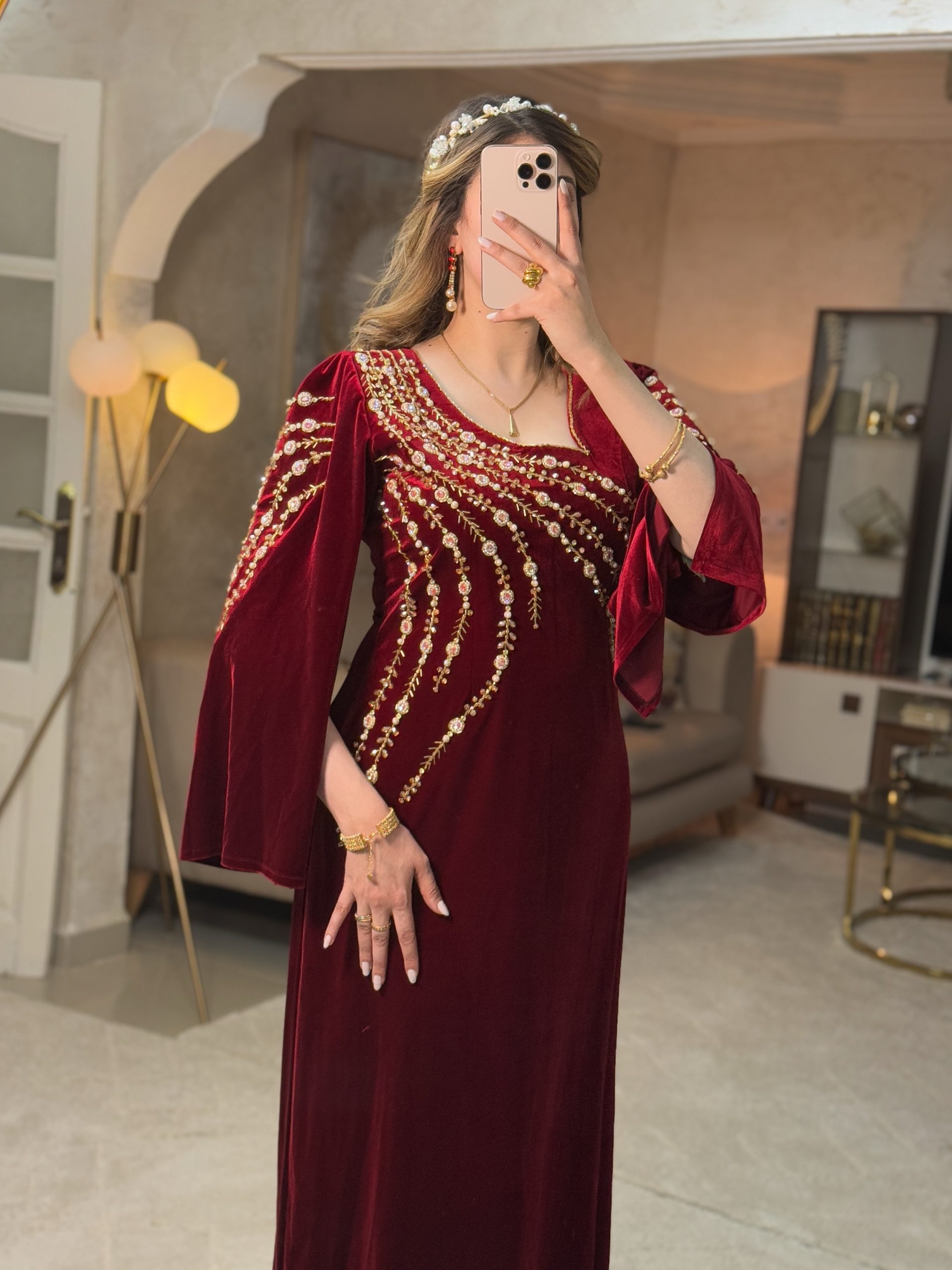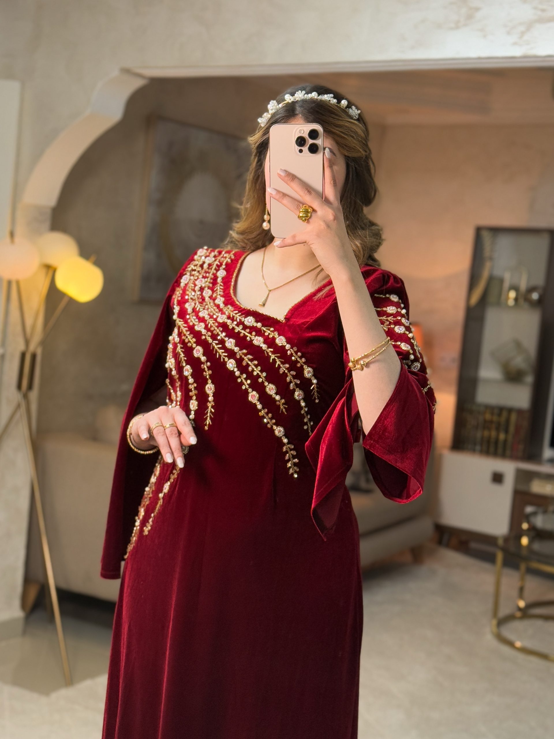 الأكمام تأتي بقصّة واسعة وانسيابية تمنح الفستان حضورًا ملكيًا، ومزدانة بتطريز متناسق مع نقش الرقبة لإكمال التوازن الجمالي وإظهار روعة التصميم.