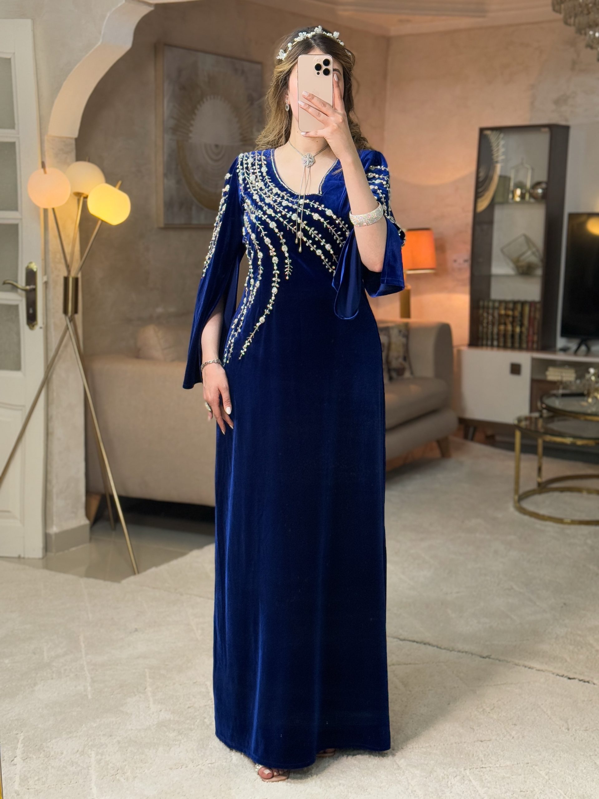 الأكمام تأتي بقصّة واسعة وانسيابية تمنح الفستان حضورًا ملكيًا، ومزدانة بتطريز متناسق مع نقش الرقبة لإكمال التوازن الجمالي وإظهار روعة التصميم.