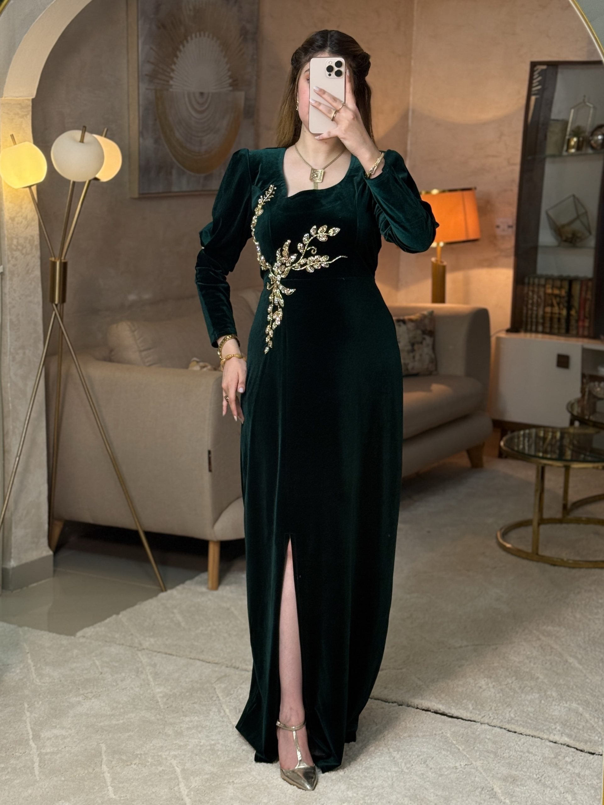 فستان بريق بتصميم راقٍ ومميز، يأتي بقصّة أنثوية مع شقّ أمامي يصل إلى حدود الركبة لإضافة لمسة جريئة وراقية.