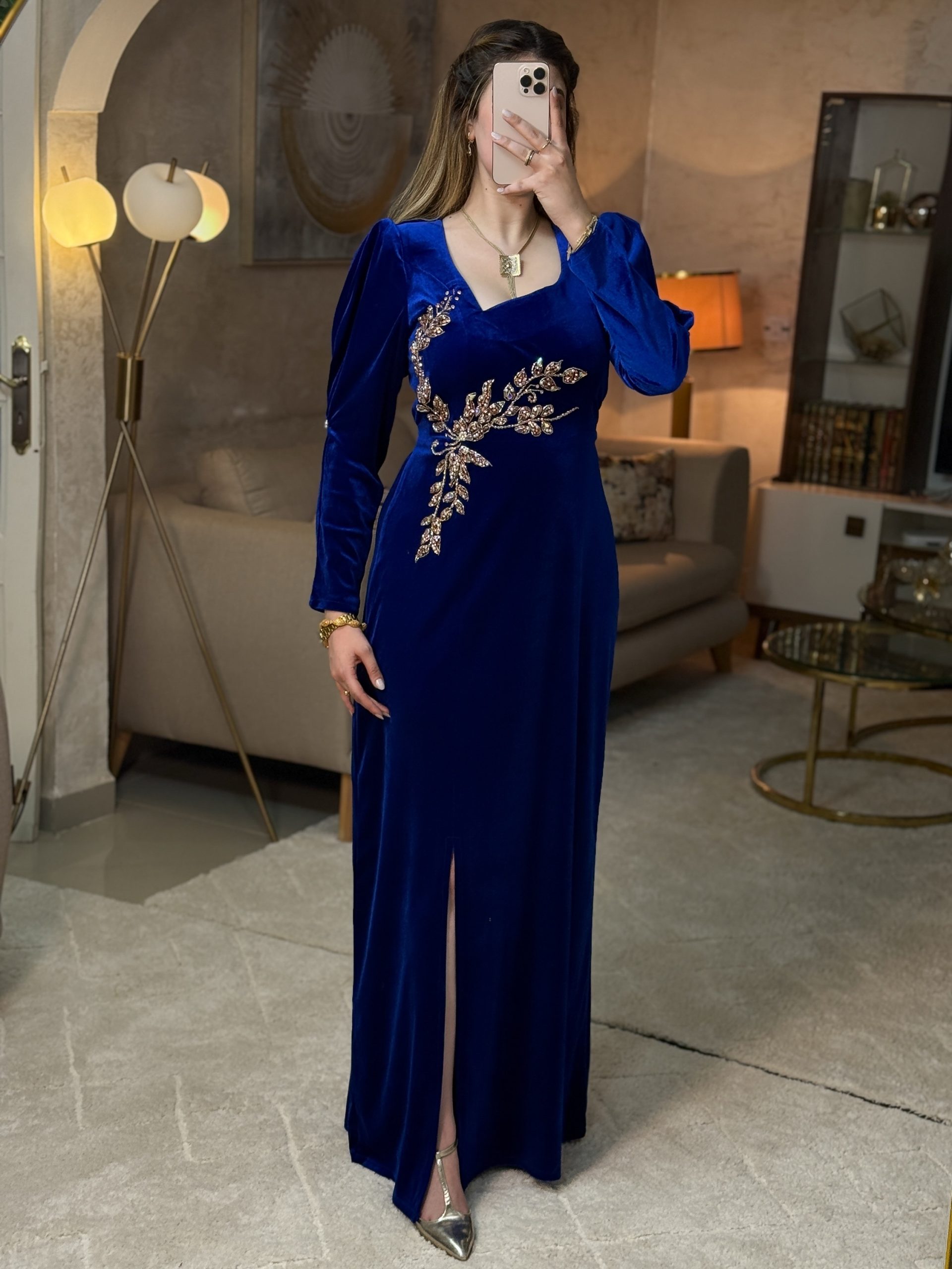 فستان بريق بتصميم راقٍ ومميز، يأتي بقصّة أنثوية مع شقّ أمامي يصل إلى حدود الركبة لإضافة لمسة جريئة وراقية.