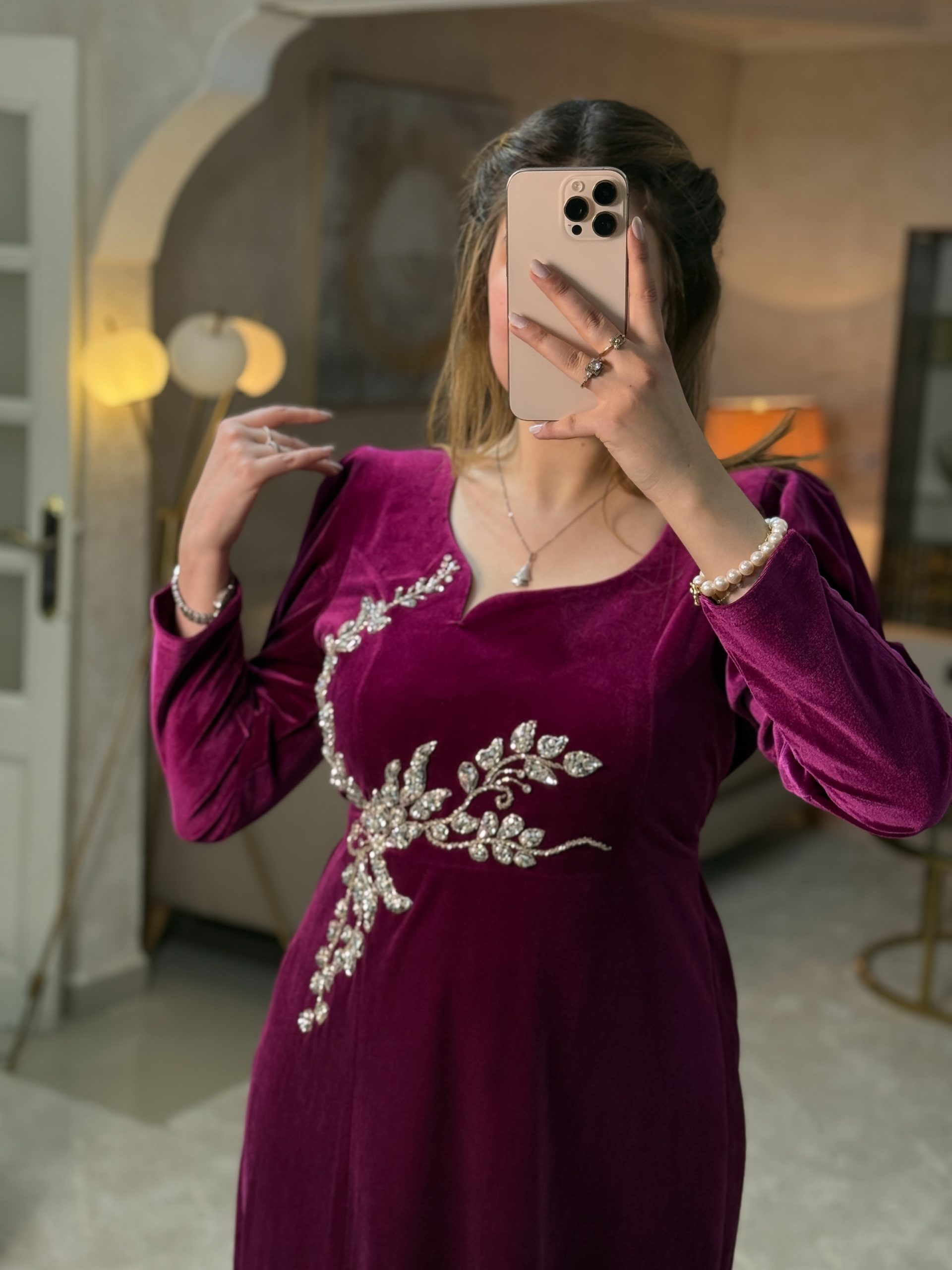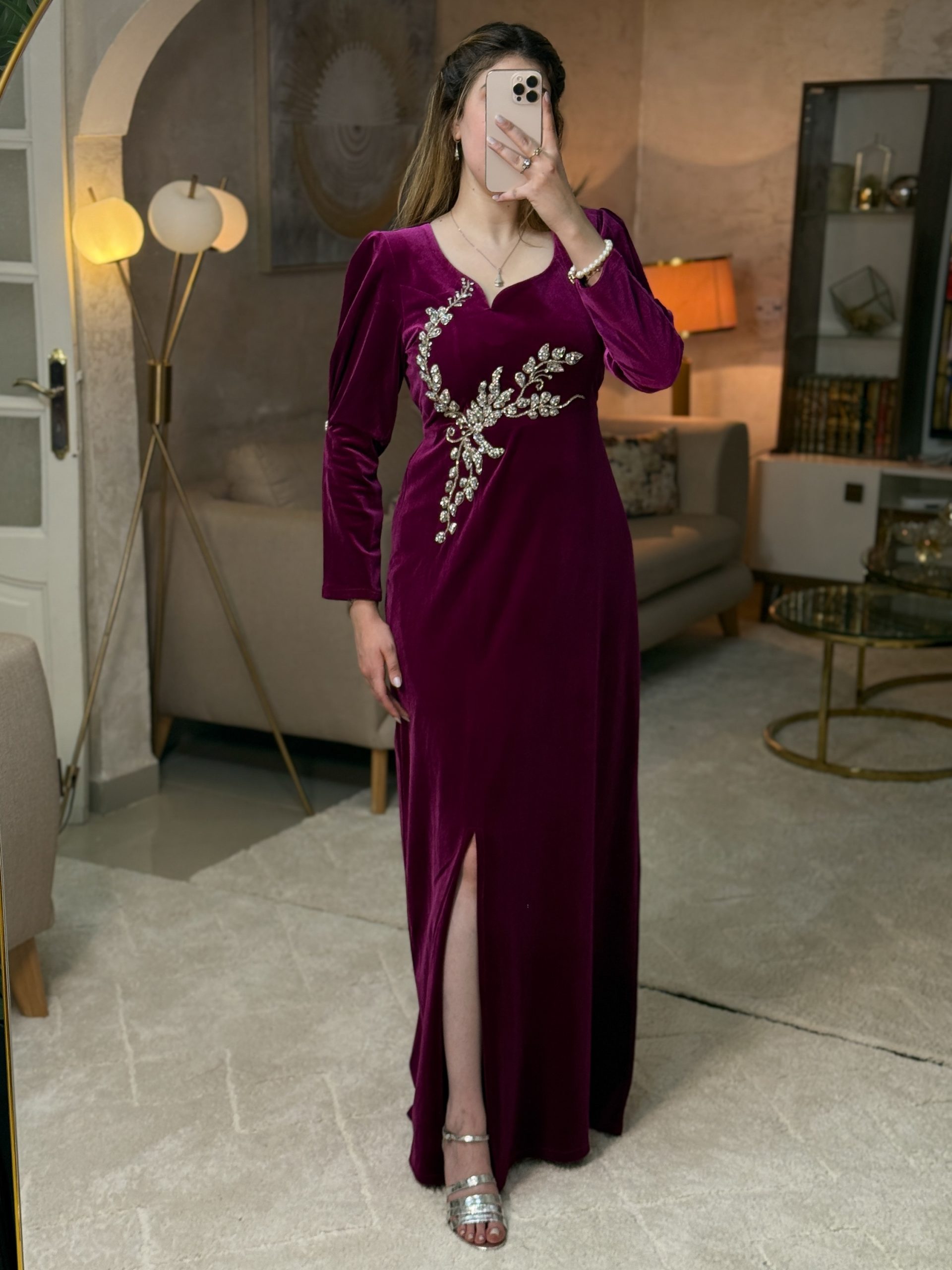 فستان بريق بتصميم راقٍ ومميز، يأتي بقصّة أنثوية مع شقّ أمامي يصل إلى حدود الركبة لإضافة لمسة جريئة وراقية.