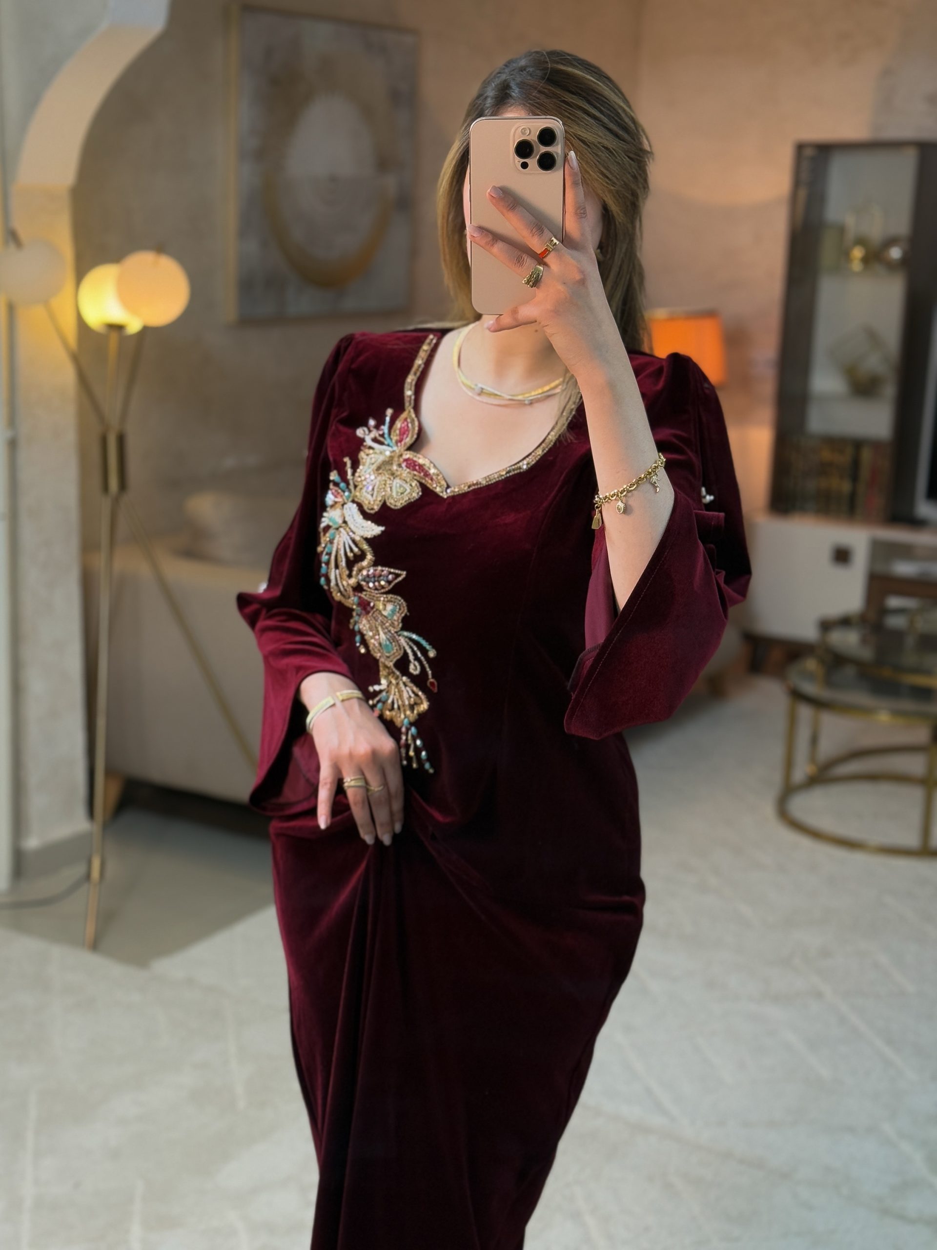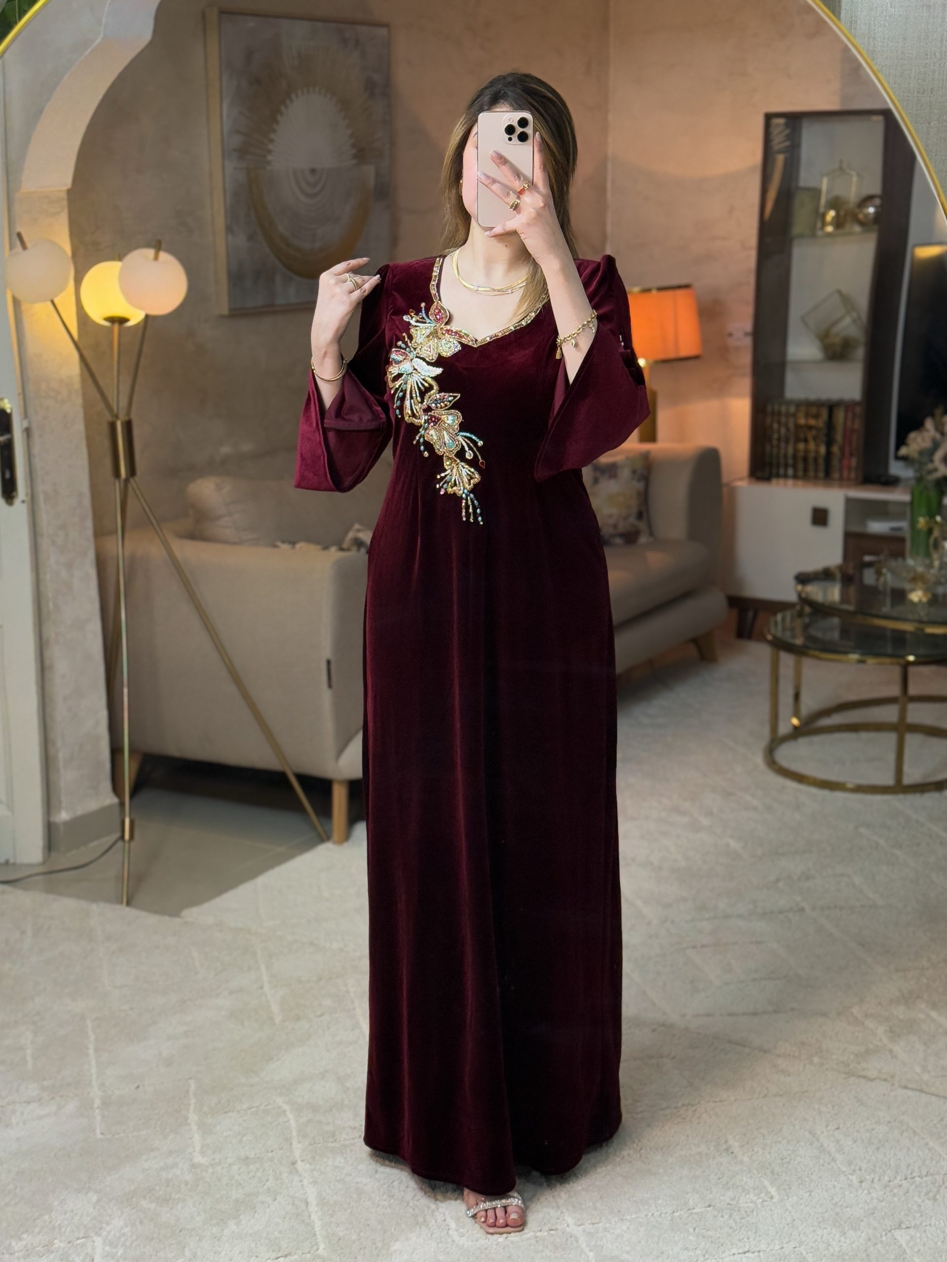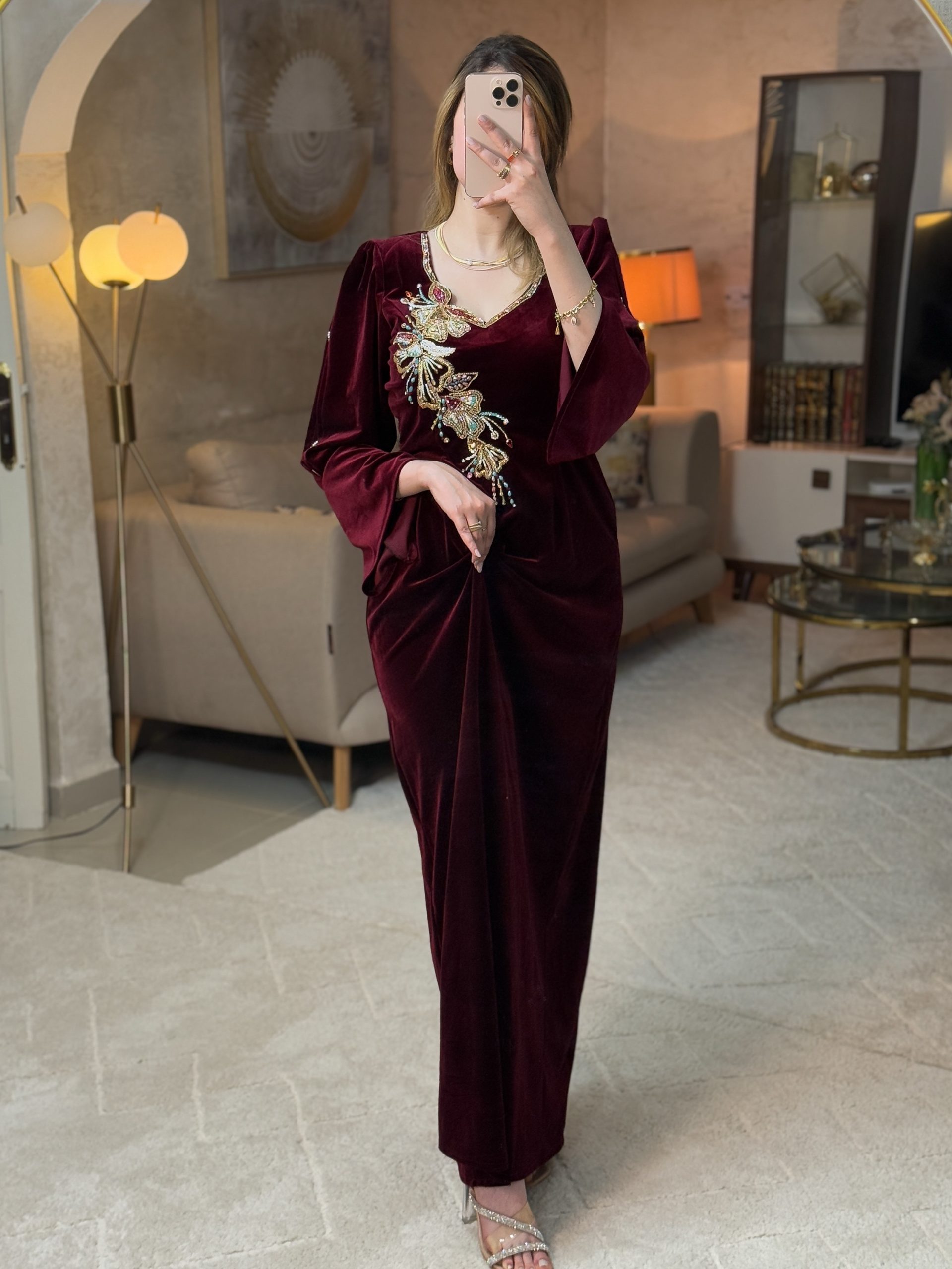 قطعة فاخرة مصنوعة من القطيفة الرويال بلمعتها الناعمة التي تضيف عمقًا وأناقة لأي إطلالة. يتميّز المودال بقصة كتف نازل تزيده أنوثة، مع أكمام واسعة قليلًا تمنحه توازنًا راقيًا بين الفخامة والبساطة.