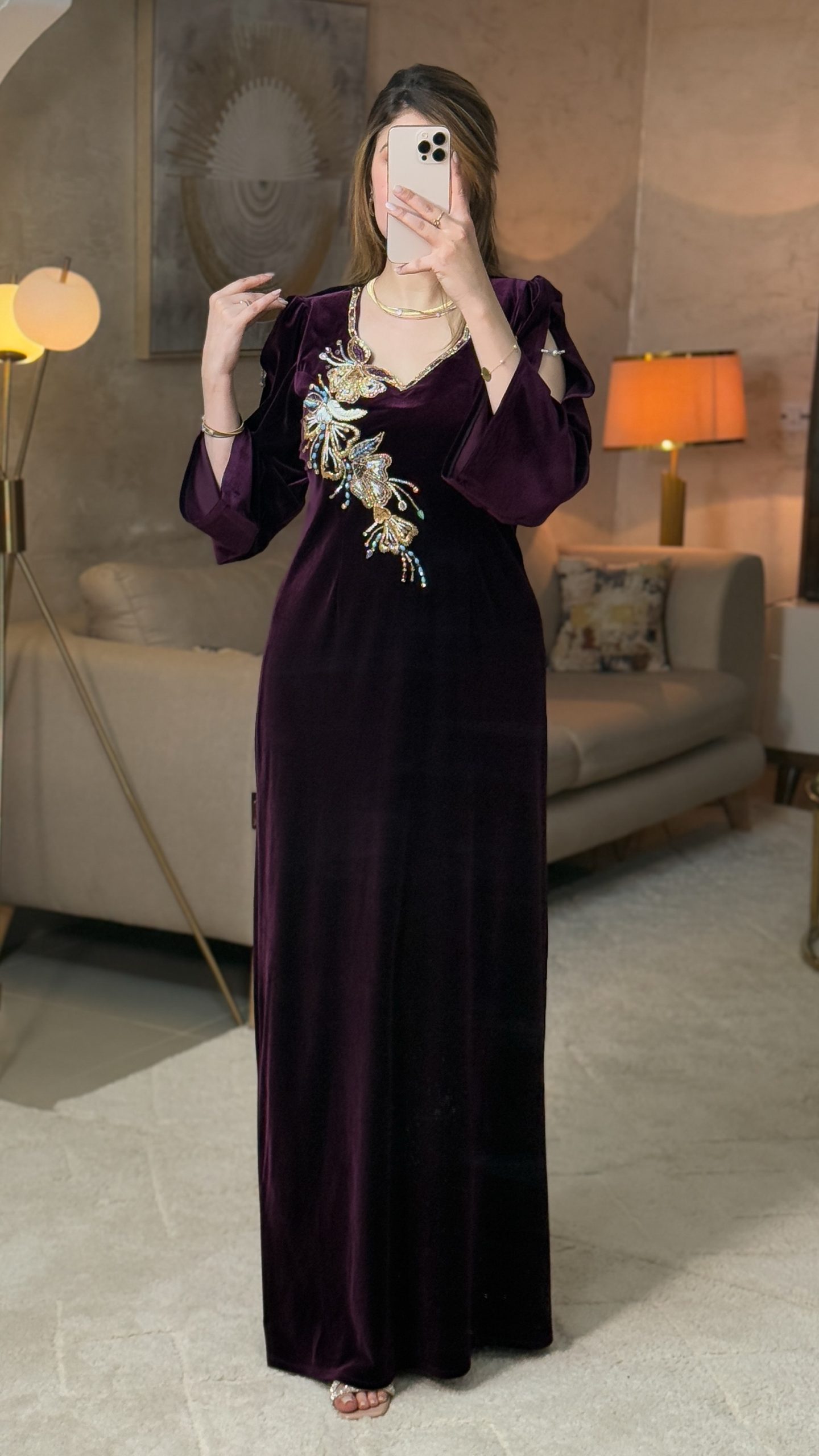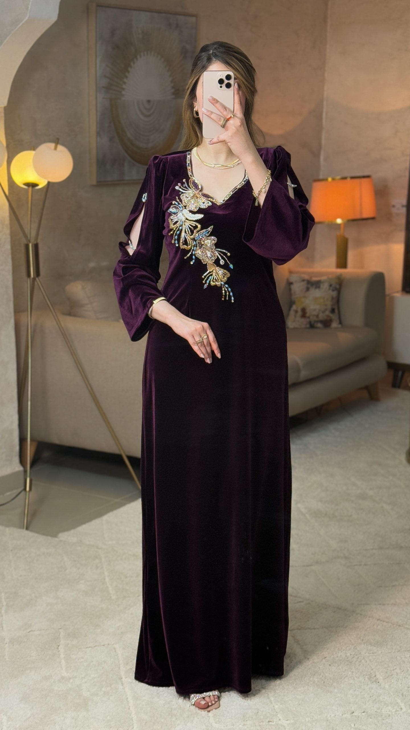 قطعة فاخرة مصنوعة من القطيفة الرويال بلمعتها الناعمة التي تضيف عمقًا وأناقة لأي إطلالة. يتميّز المودال بقصة كتف نازل تزيده أنوثة، مع أكمام واسعة قليلًا تمنحه توازنًا راقيًا بين الفخامة والبساطة.