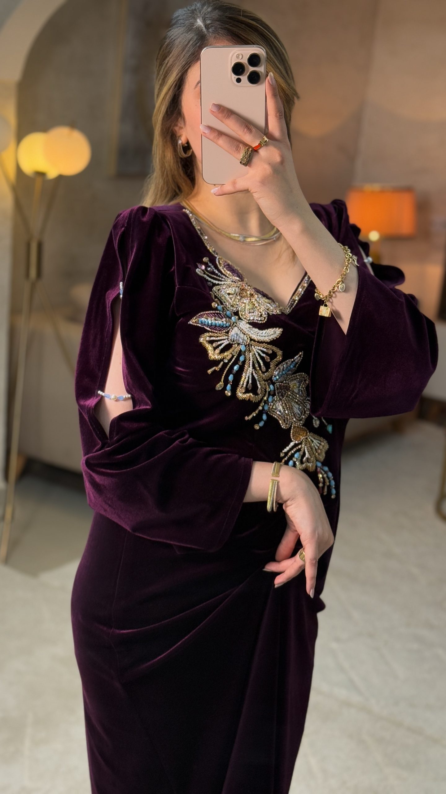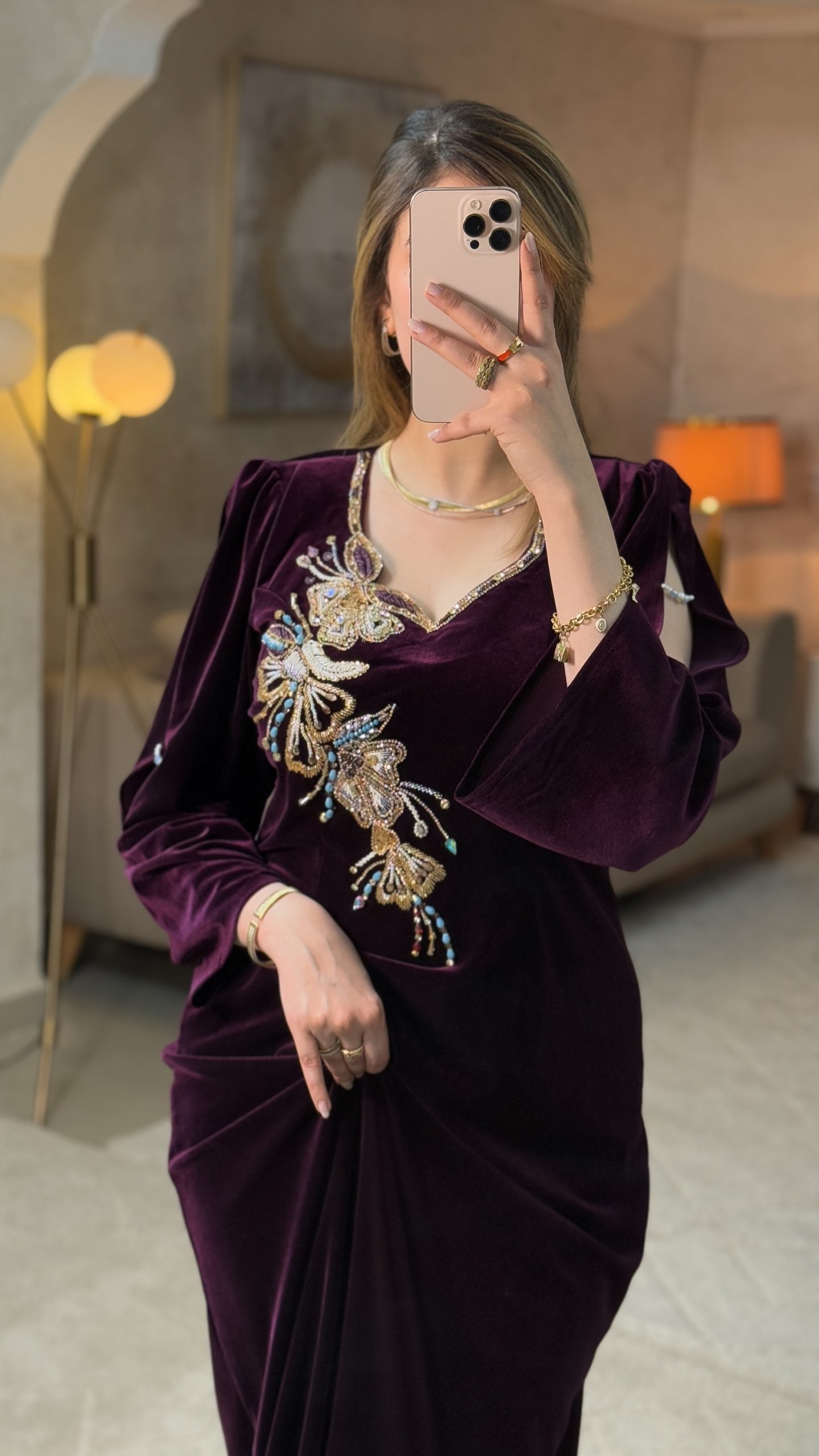 اللمسة الأجمل في هذا التصميم هي الرسم الفاخر والبرلاج الحرّ، يأتي على شكل زخارف فنية متداخلة تعطي للمودال حركة وانسيابية مميزة.