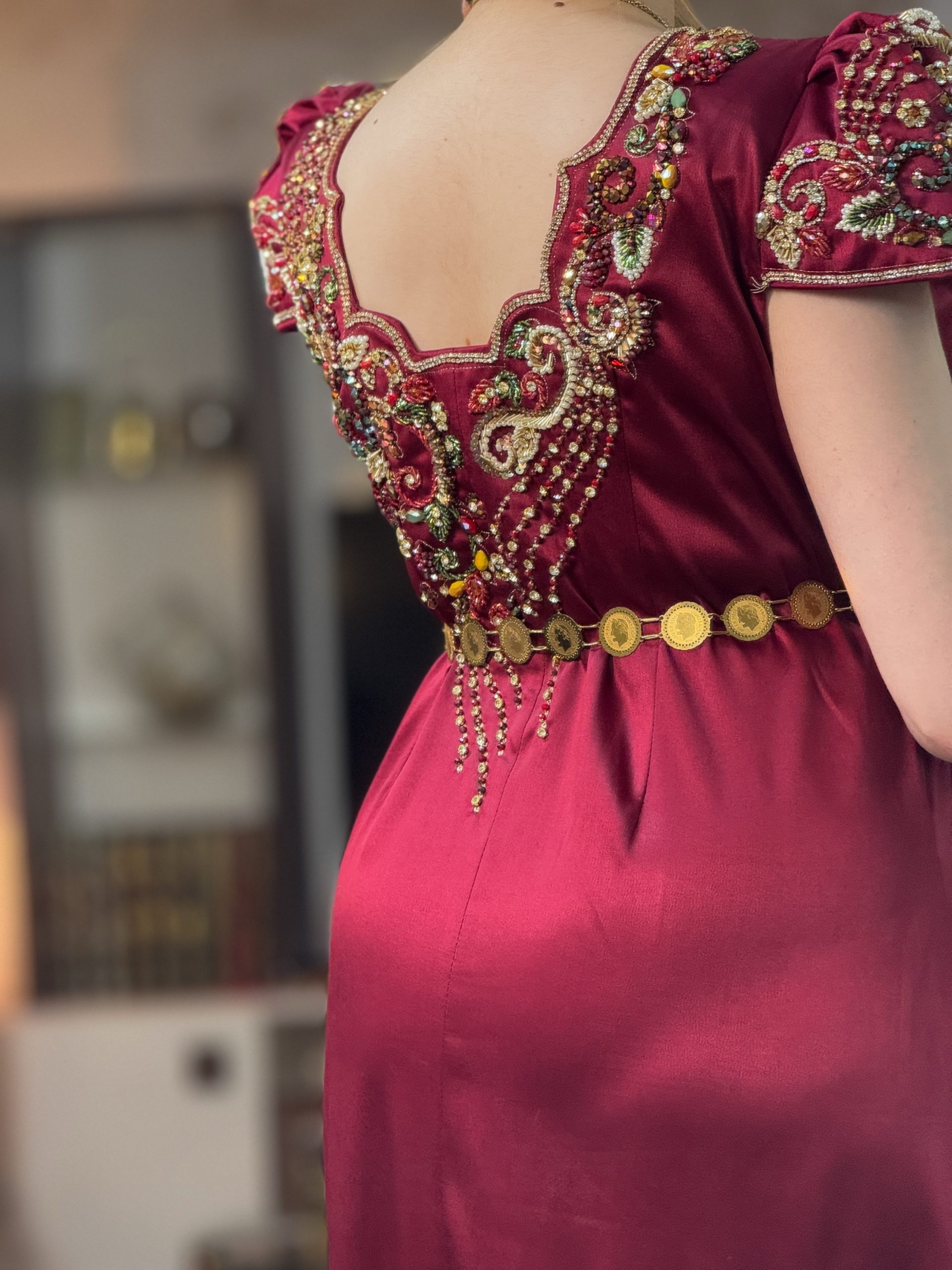 من الأمام: تطريز يدوي فاخر على الصدر والأكتاف يبرز الفستان ويمنحه لمسة فخامة، مع قصّة محدّدة أسفل الصدر تبرز القوام بنعومة.