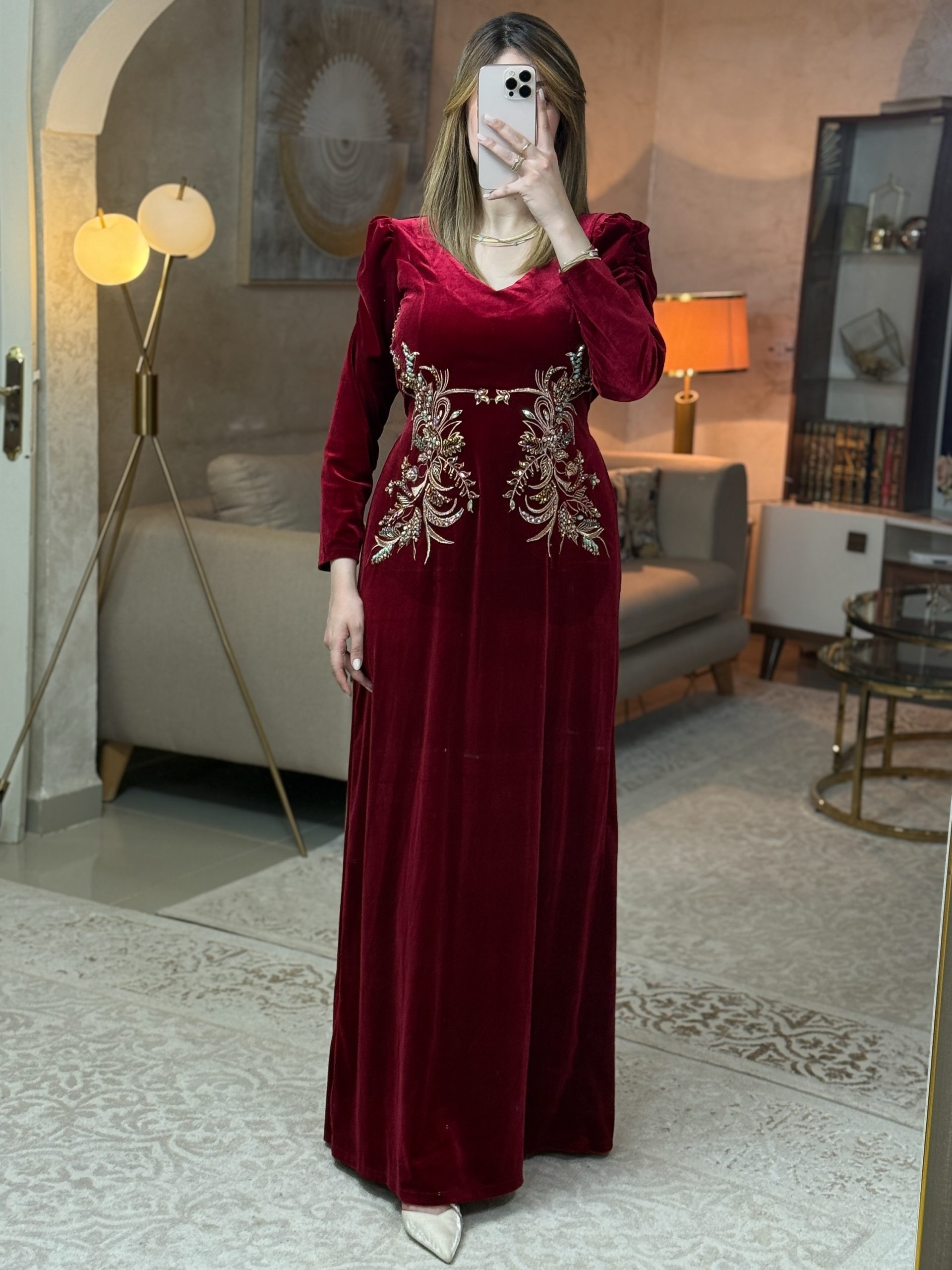 التركيز الأساسي في هذا المودال هو التطريز الفاخر في منطقة الخصر والكرش، مصنوع بالشعرة والبرلاج الحرّ على شكل زخارف متداخلة تعطي إحساسًا بالحركة والفخامة. يأتي مع حزام يبرز الخصر ويكمّل جمال القطعة بانسيابية مميزة.