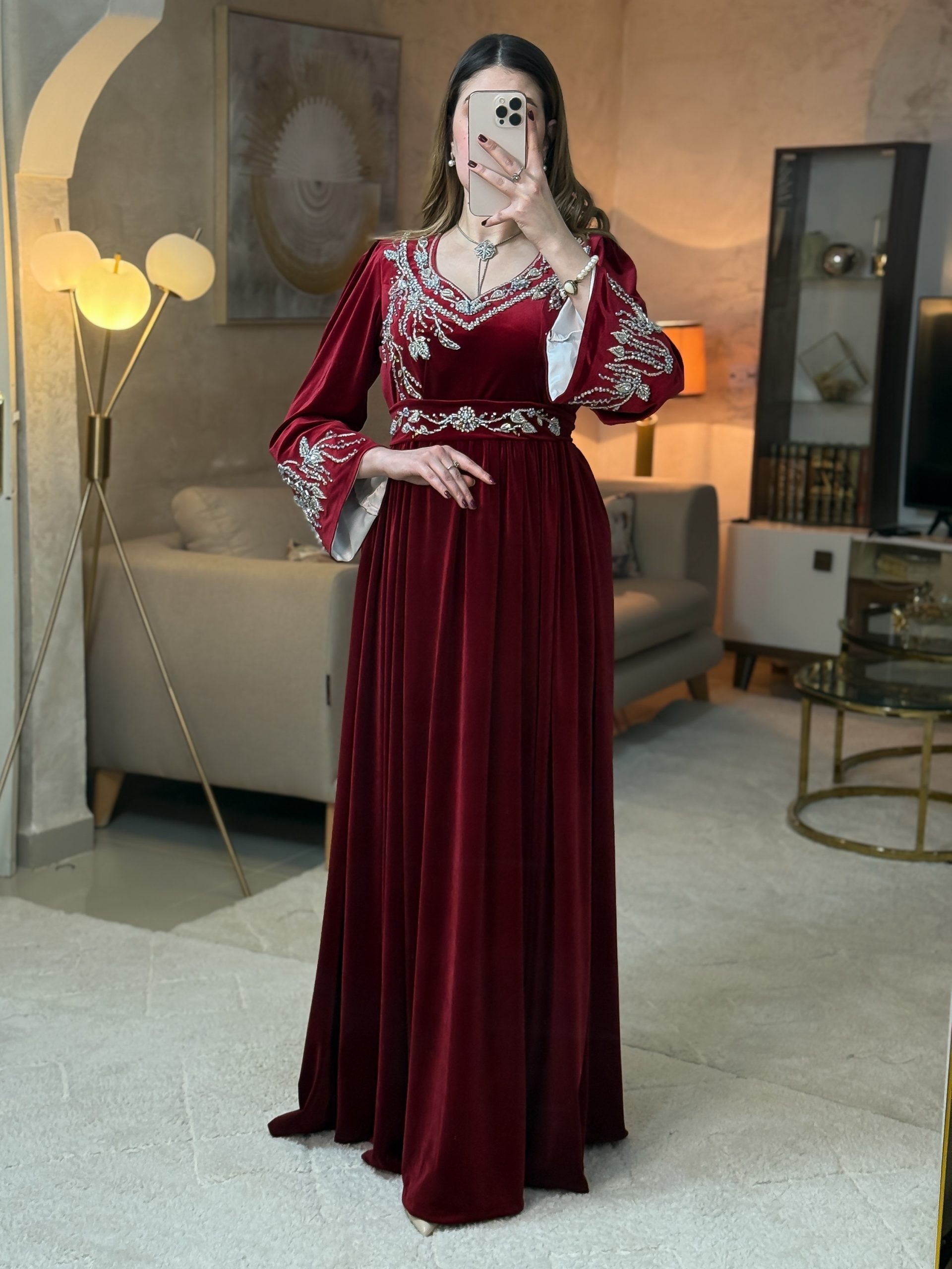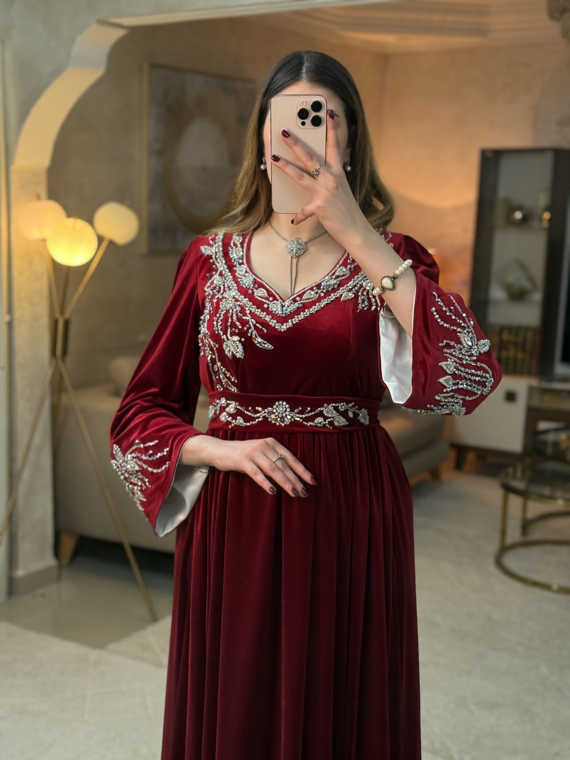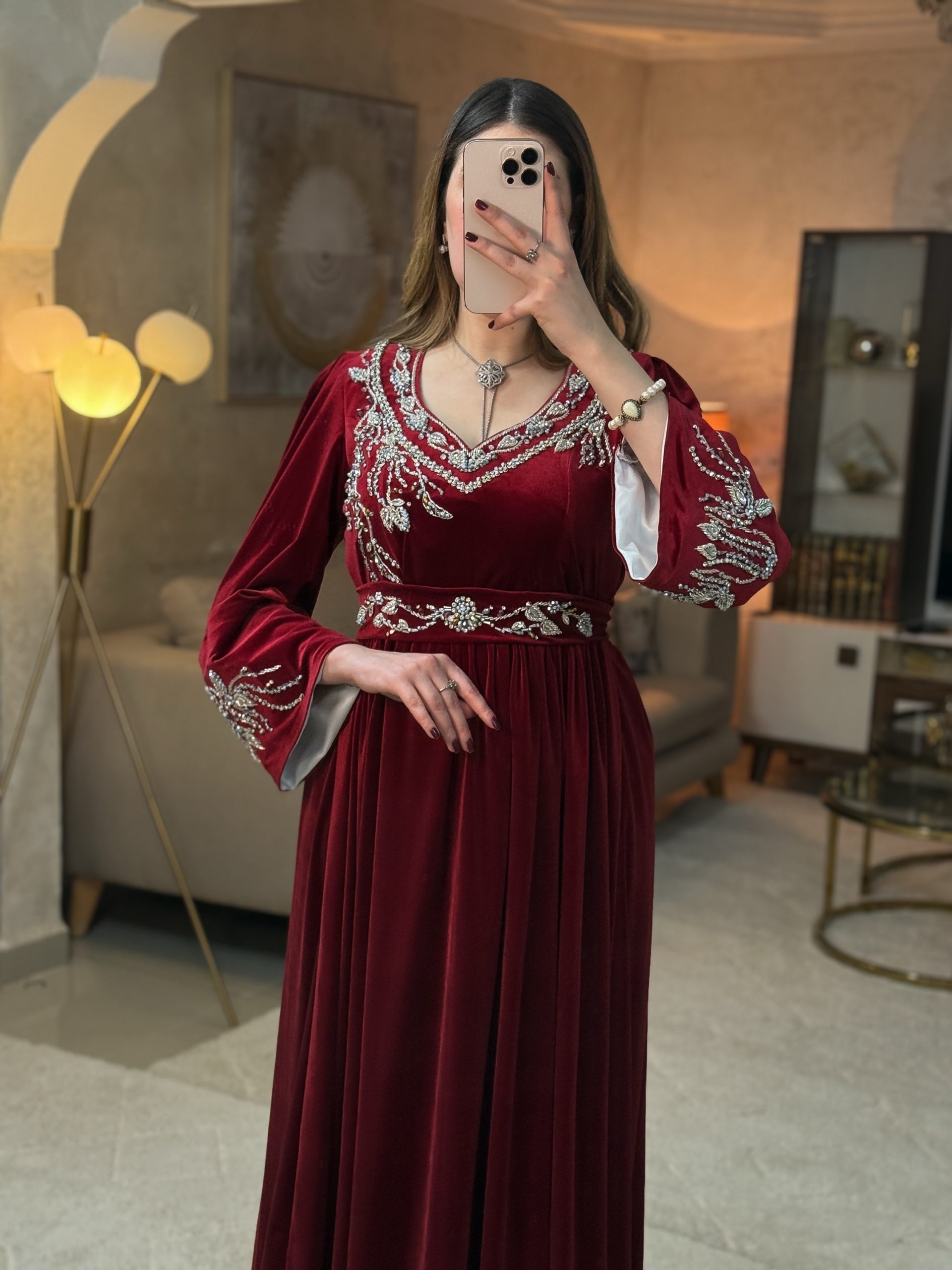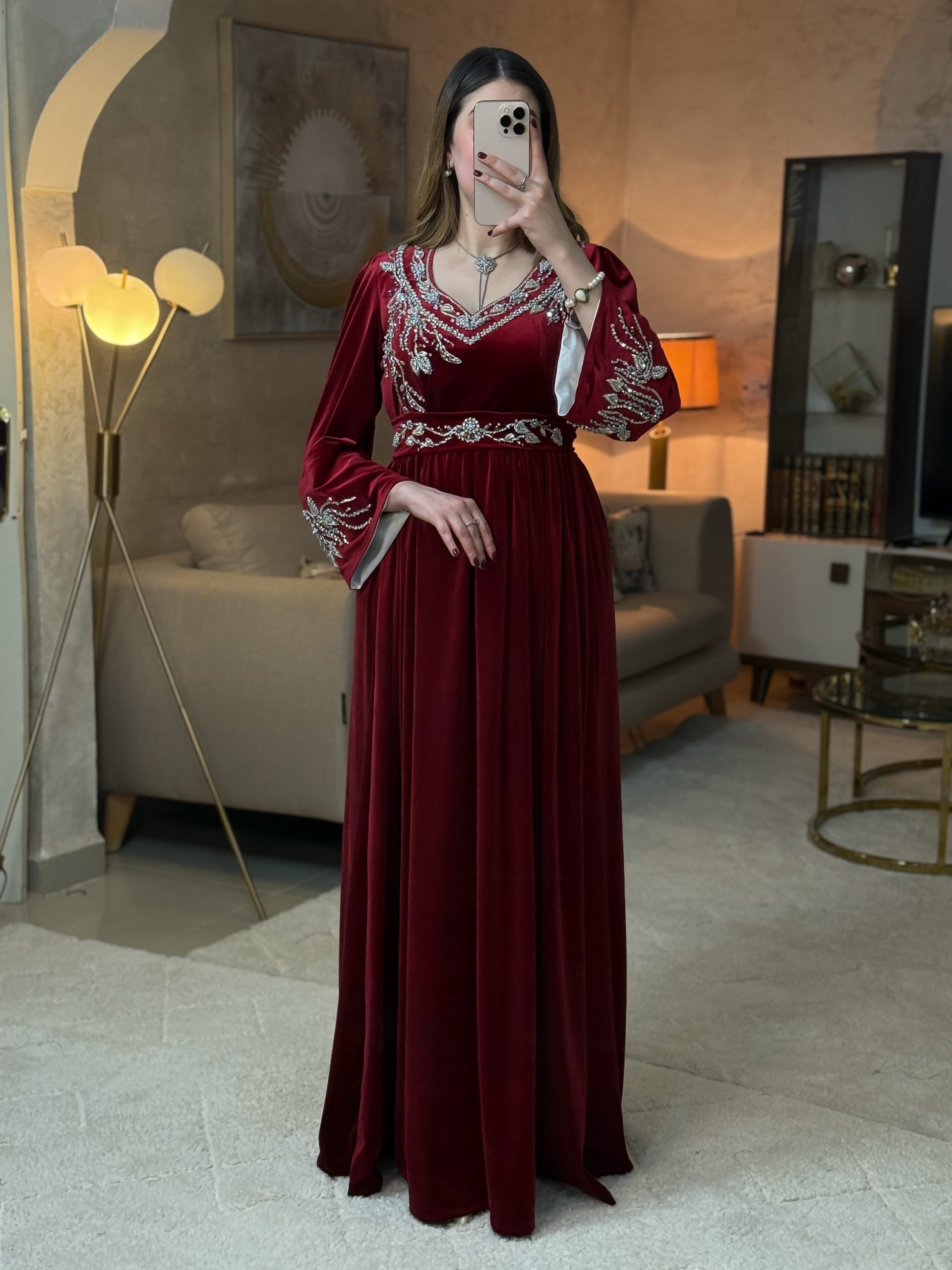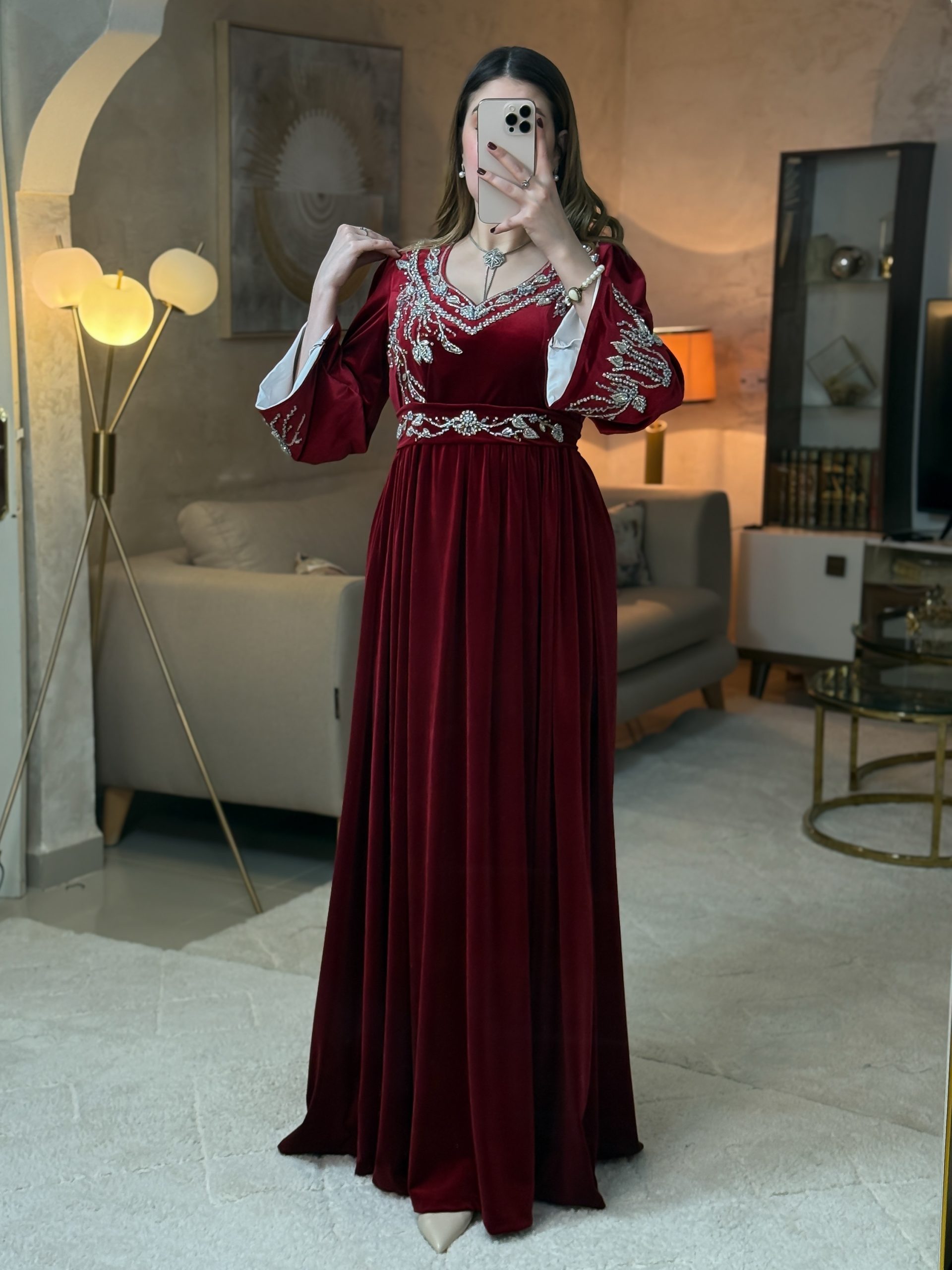 يتزيّن بتطريز ذهبي يدوي فاخر، مستوحى من بريق الجواهر ، ينساب بتناغم على الصدر والأكمام ليمنح الفستان طابعًا ملكيًا لا يُنسى.