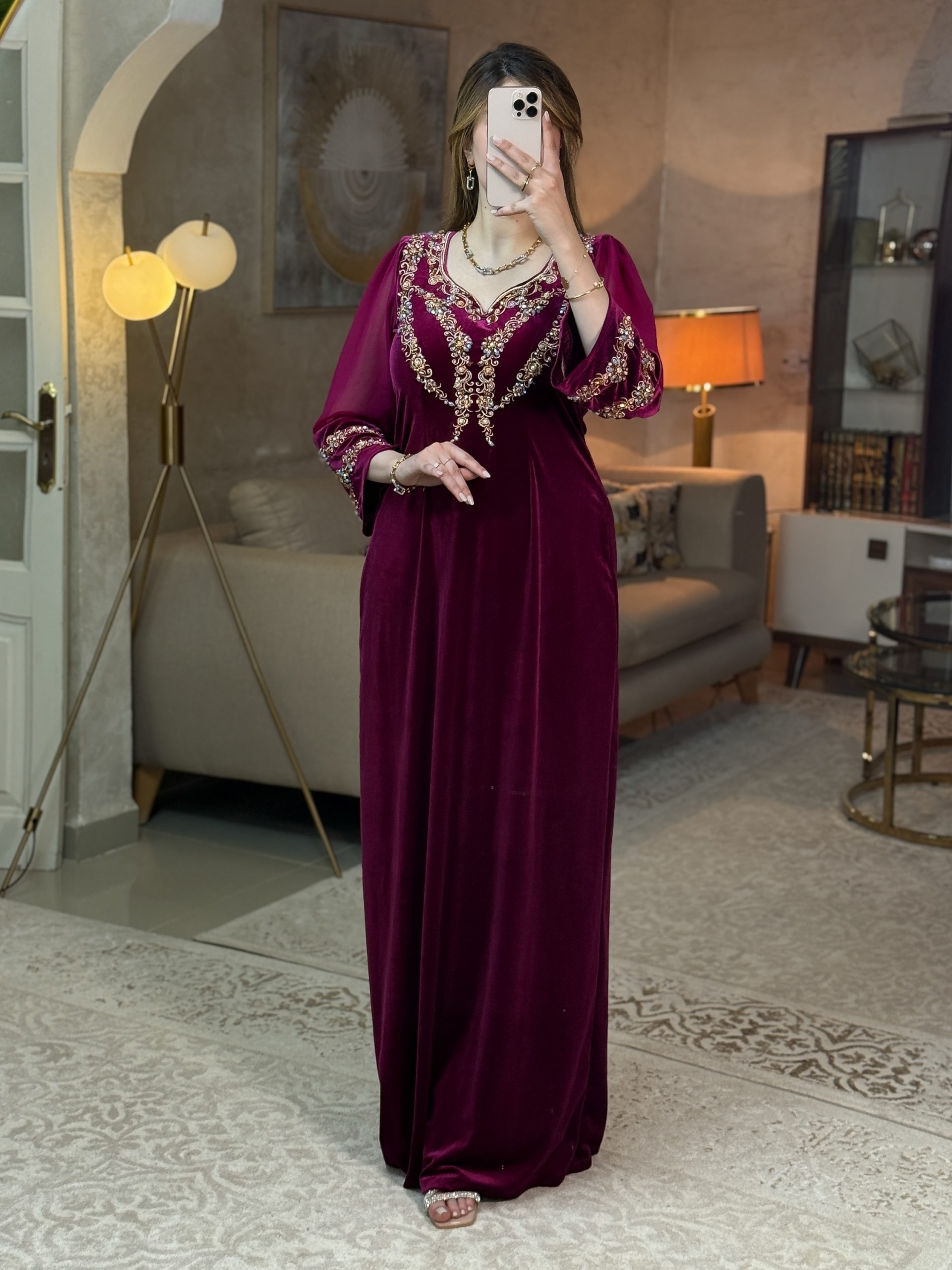 الأكمام مصمّمة من قماش الموسلين المتناسق مع خامة الفستان، بقَصّة انسيابية ناعمة، وتنتهي بخطَّي تطريز مستوحاة من نقشة الرقبة لخلق توازن أنيق ومتكامل.
