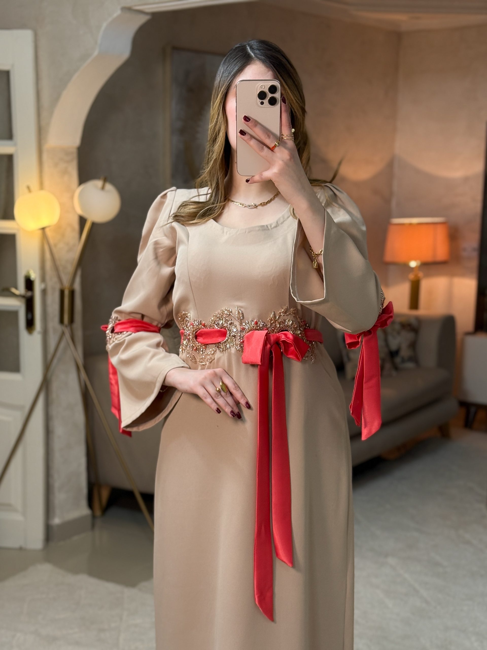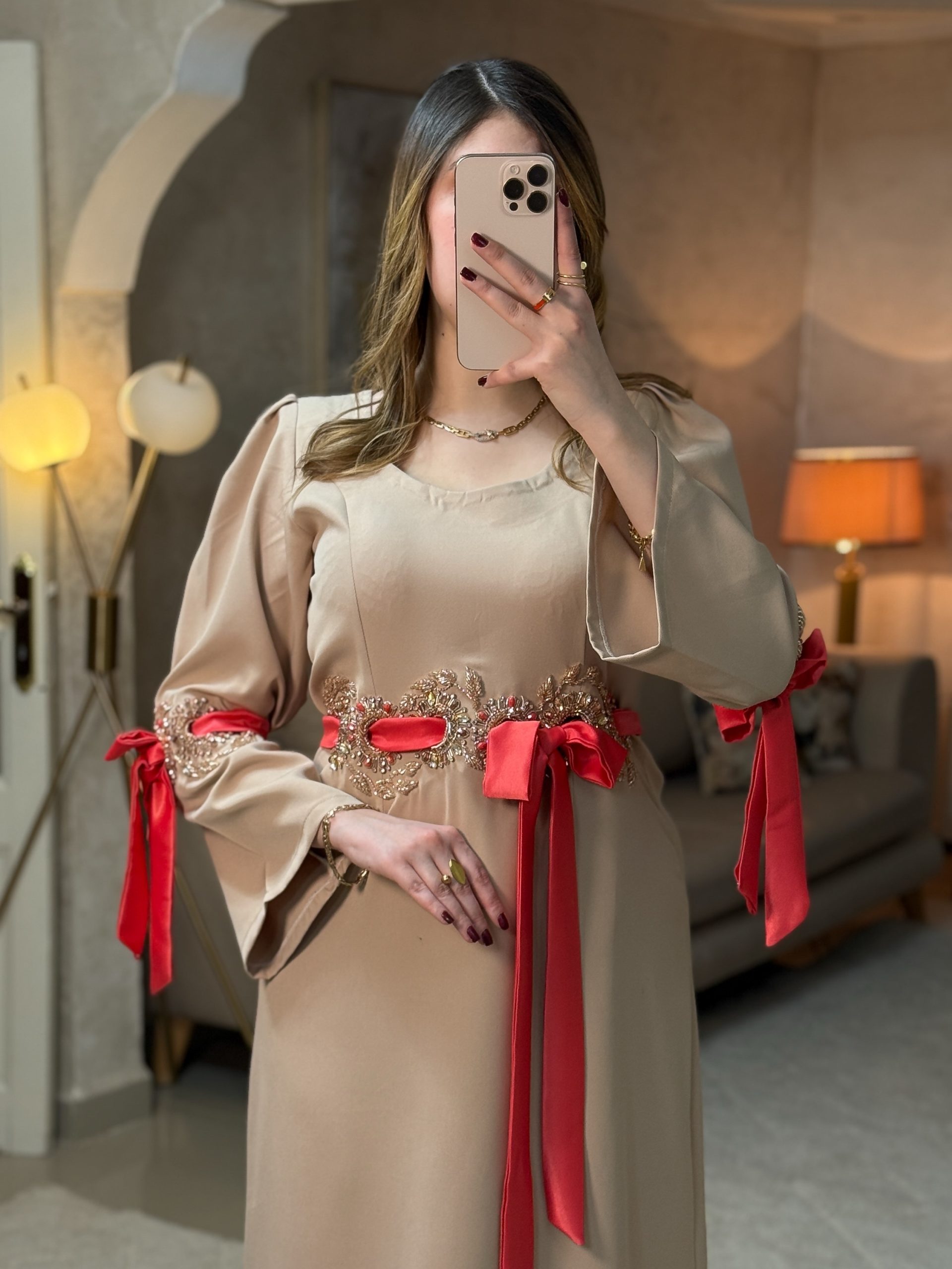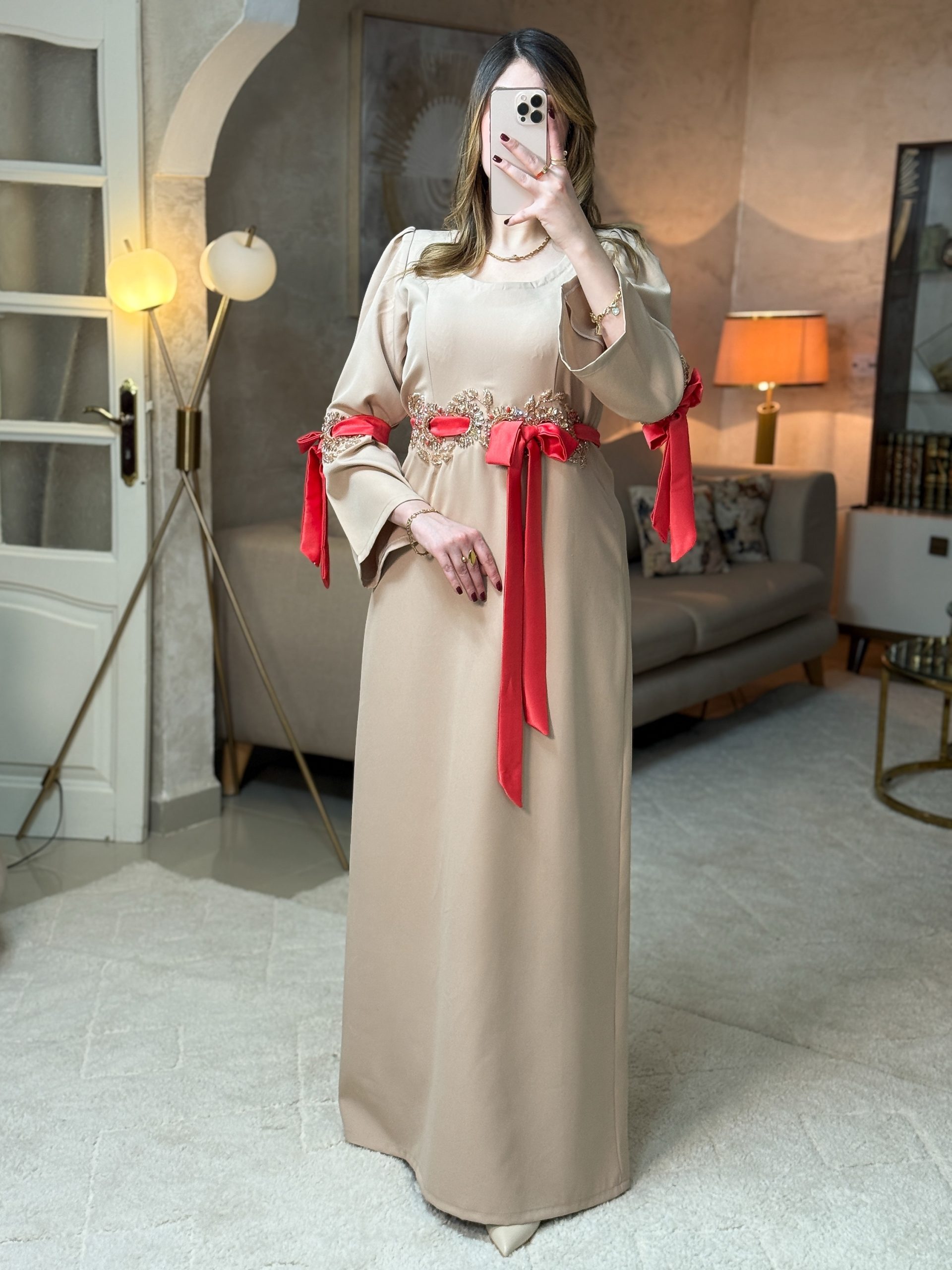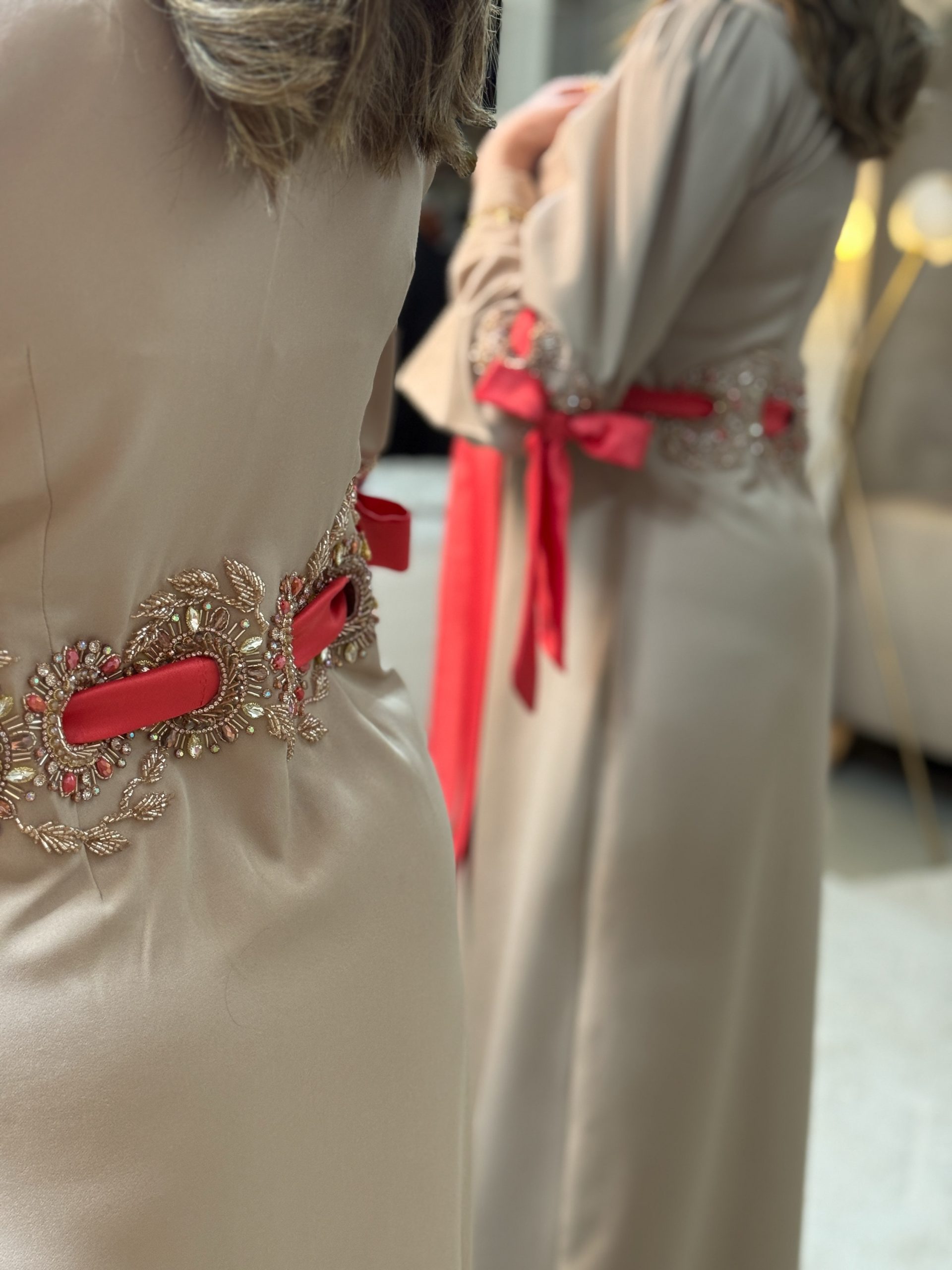 صُمّم ليجسّد الفخامة الهادئة والتفرّد في أدق التفاصيل. مخدوم يدويًا بالحر بالابرة و الخيط بتطريز راقٍ يزيّن الخصر بانسجام فاخر، مع حزام انيق يكمل تدرج الالوان و يبرز القوام برقي ونعومة.