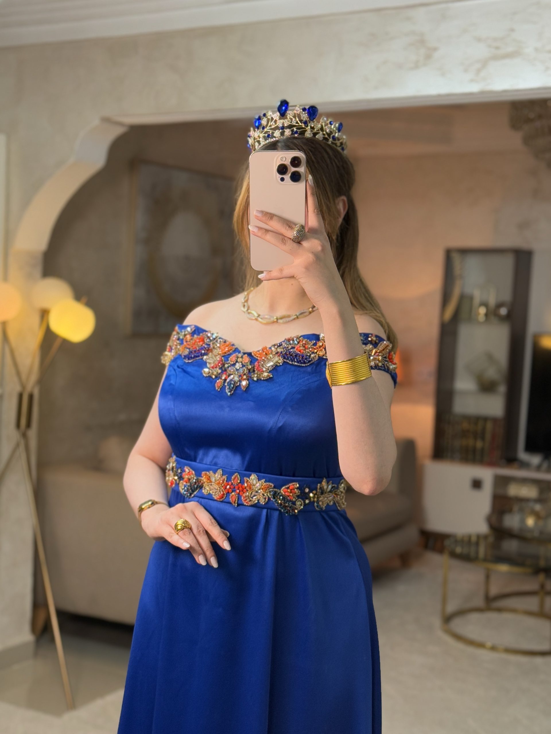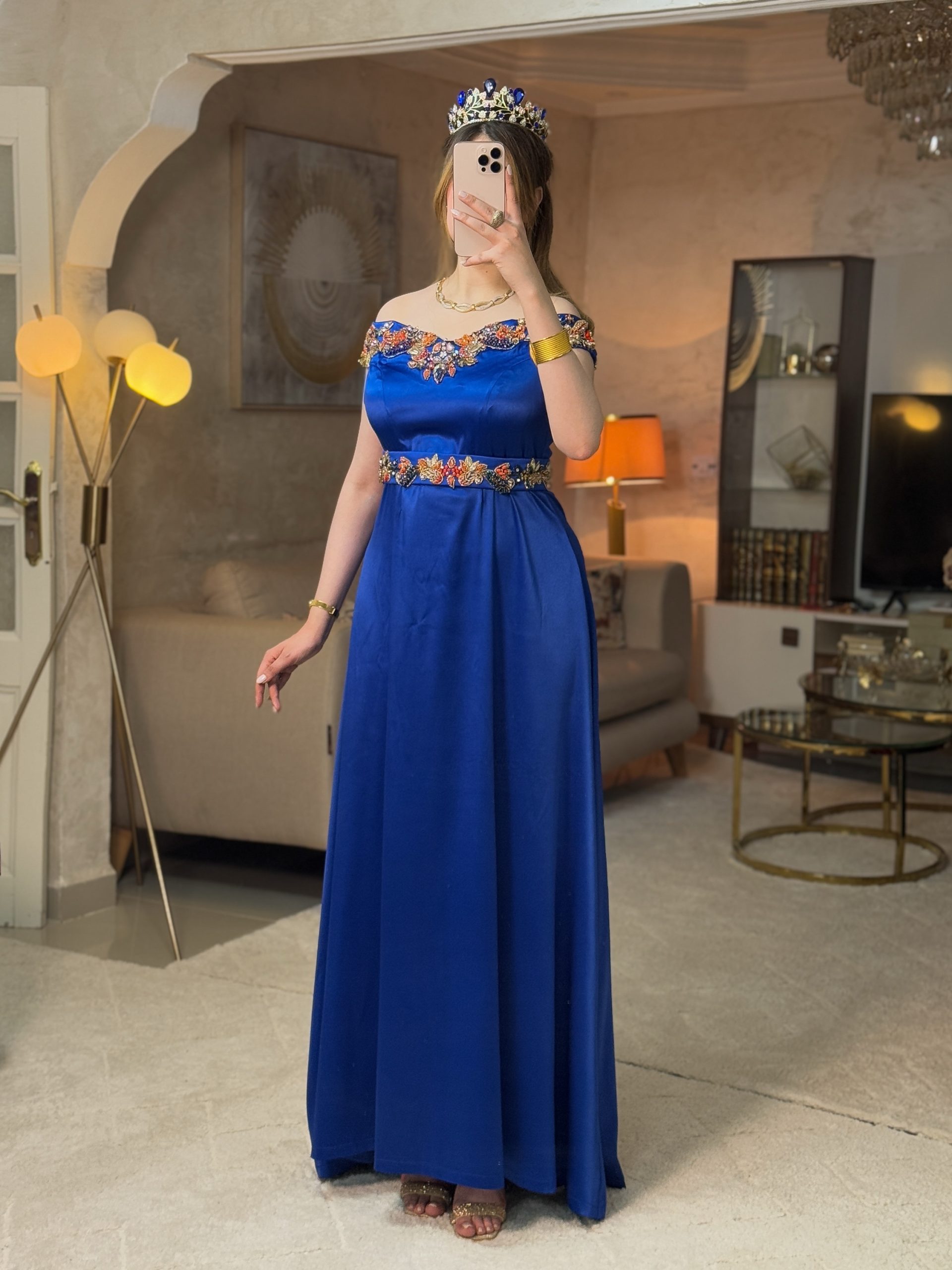 فستان شهرزاد بتصميم وهراني فاخر، يتميّز بأكتاف نازلة تمنح إطلالة أنثوية ناعمة وأنيقة. تأتي منطقة الرقبة مطرّزة بالكامل بالبرلاج الحُرّ، بتفاصيل دقيقة تمنح الفستان وهجًا ملكيًا يشبه فساتين الأميرات.