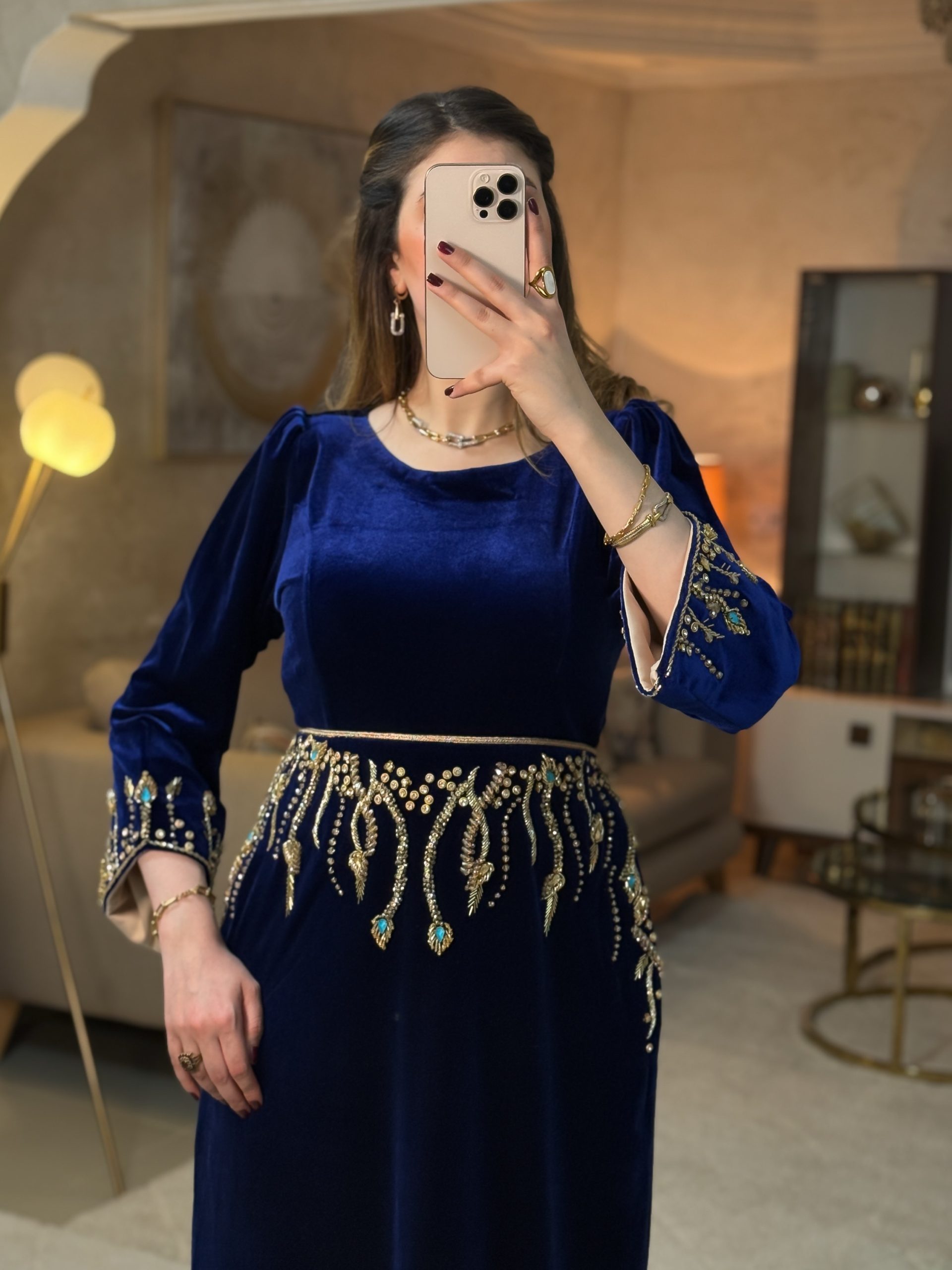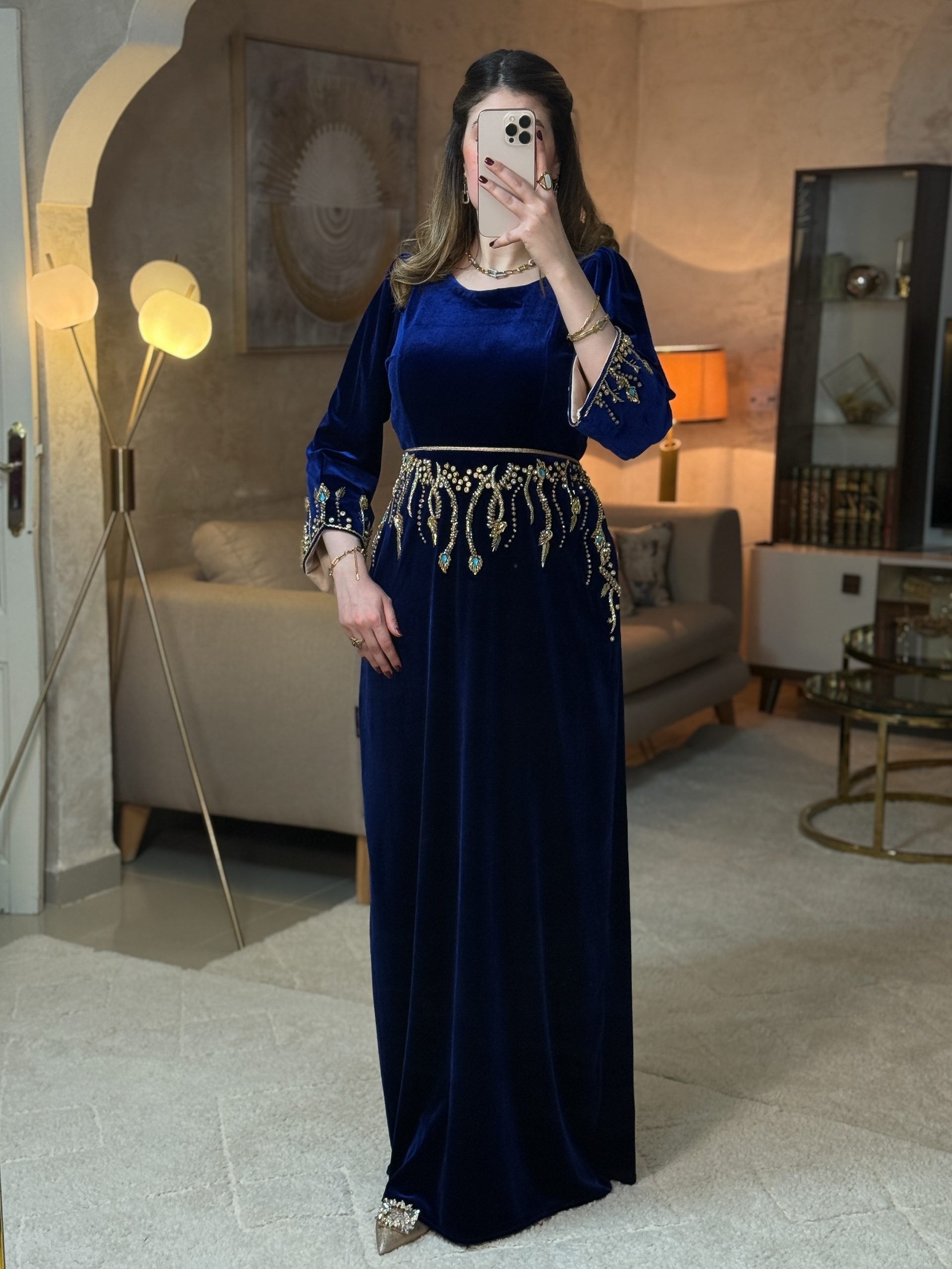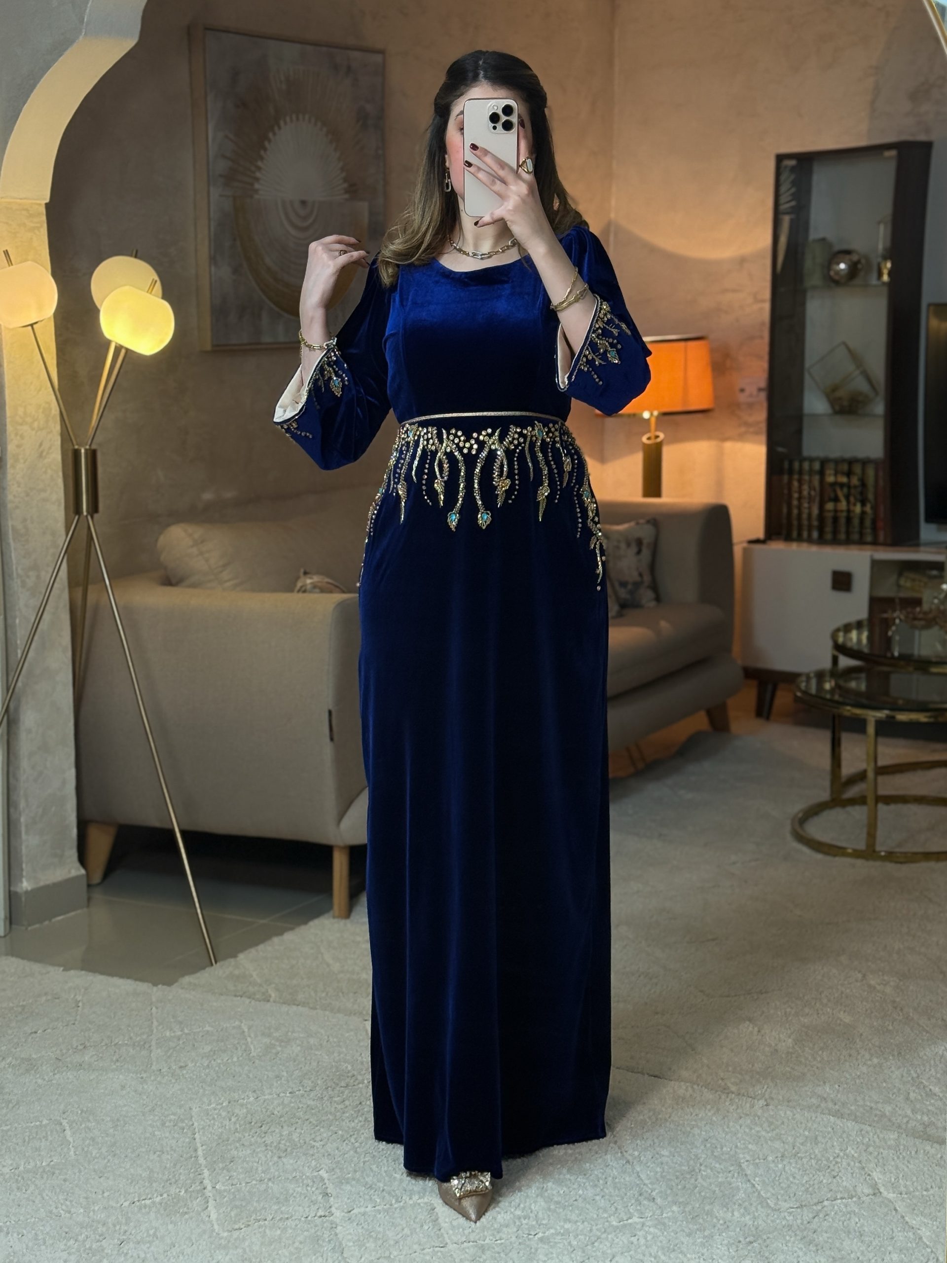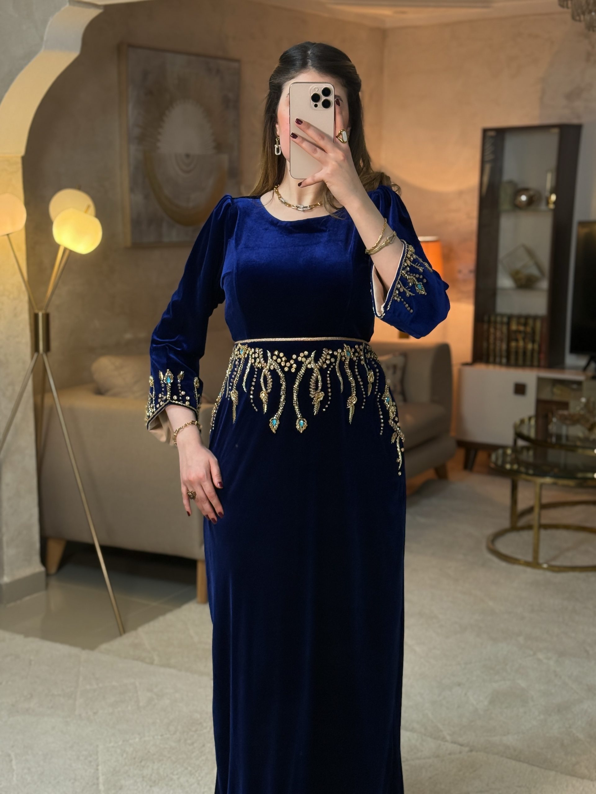 فستان طويل بقصّة مستقيمة وانسياب يوحي بالفخامة والرقي. يتوسطه تطريز يدوي بالبرلاج الحر باللون الذهبي على الواجهة الأمامية، و حزام ذهبي مع تصميم طولي يزيد من الإحساس بالطول والأناقة. الأكمام طويلة وبسيطة، ما يوازن بين الزخرفة والهدوء ويجعل الفستان مناسبًا للإطلالات الراقية والمناسبات الخاصة.