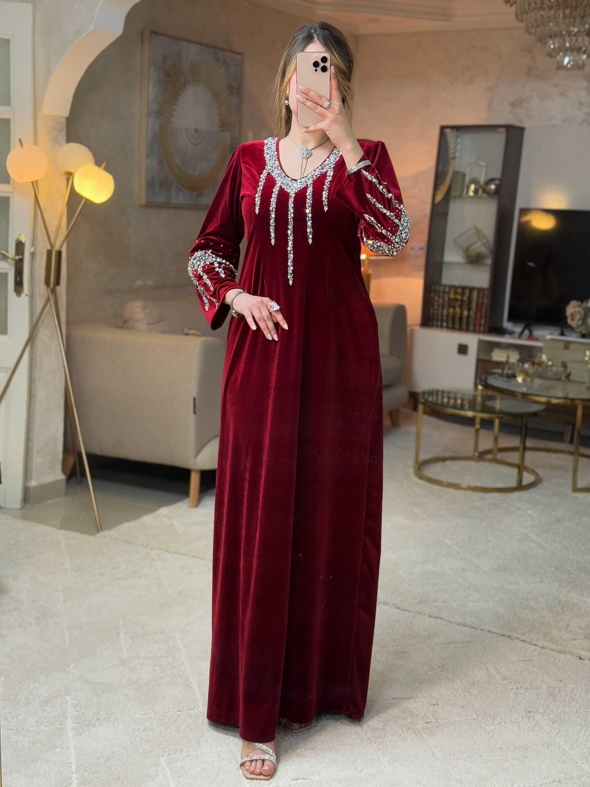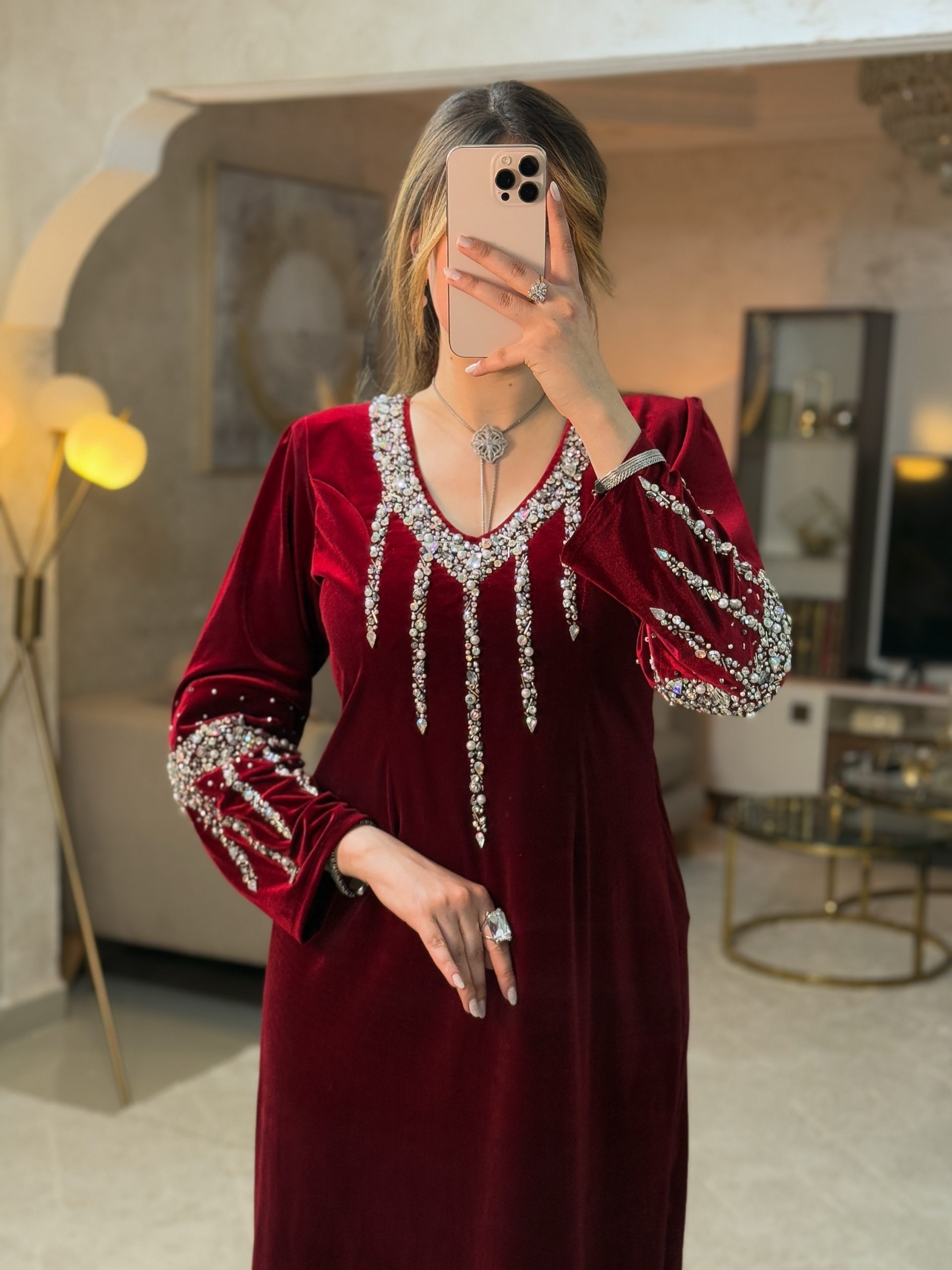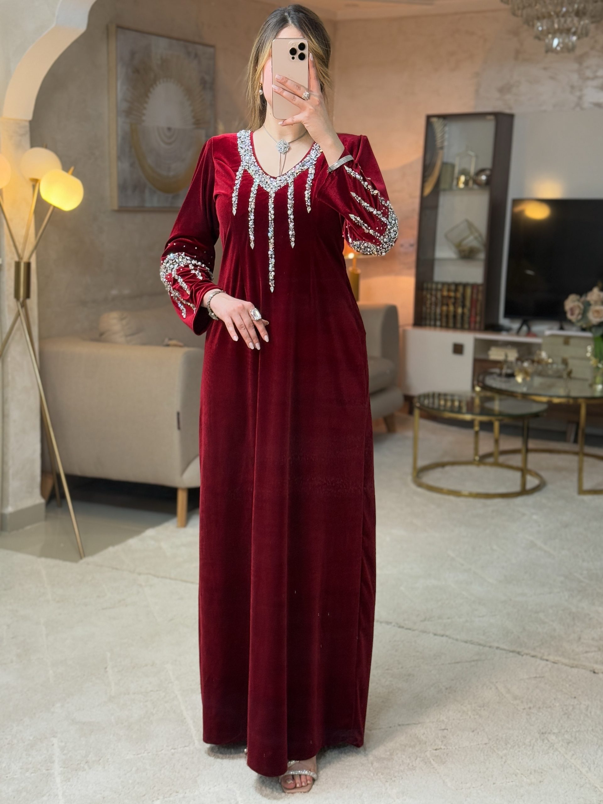 تصميم فاخر من القطيفة الراقية ، مزدان بتطريز كثيف من الأحجار اللامعة التي تنسدل من الرقبة نزولًا بشكل خطوط هندسية تزيد الإطلالة إشراقًا وأناقة.
