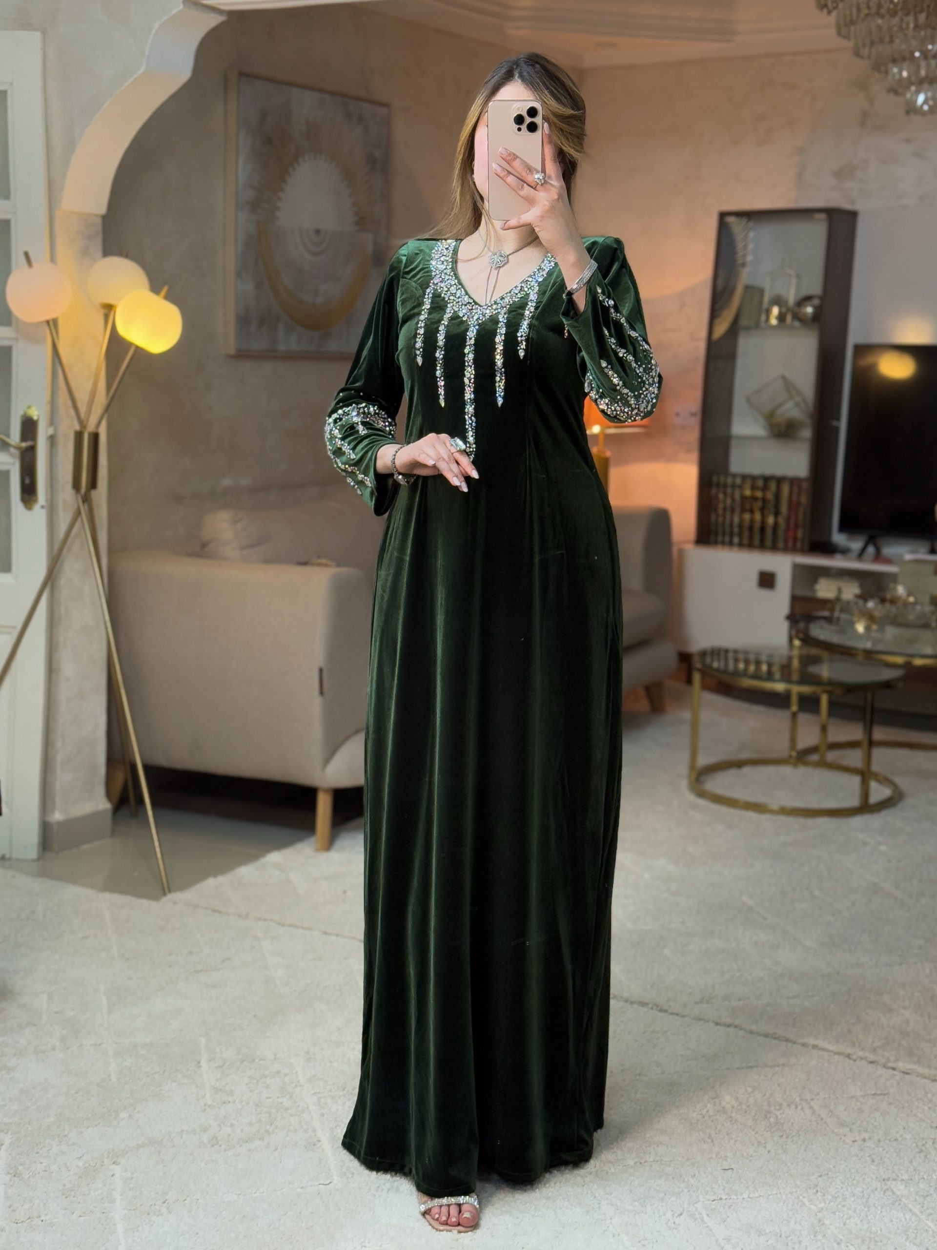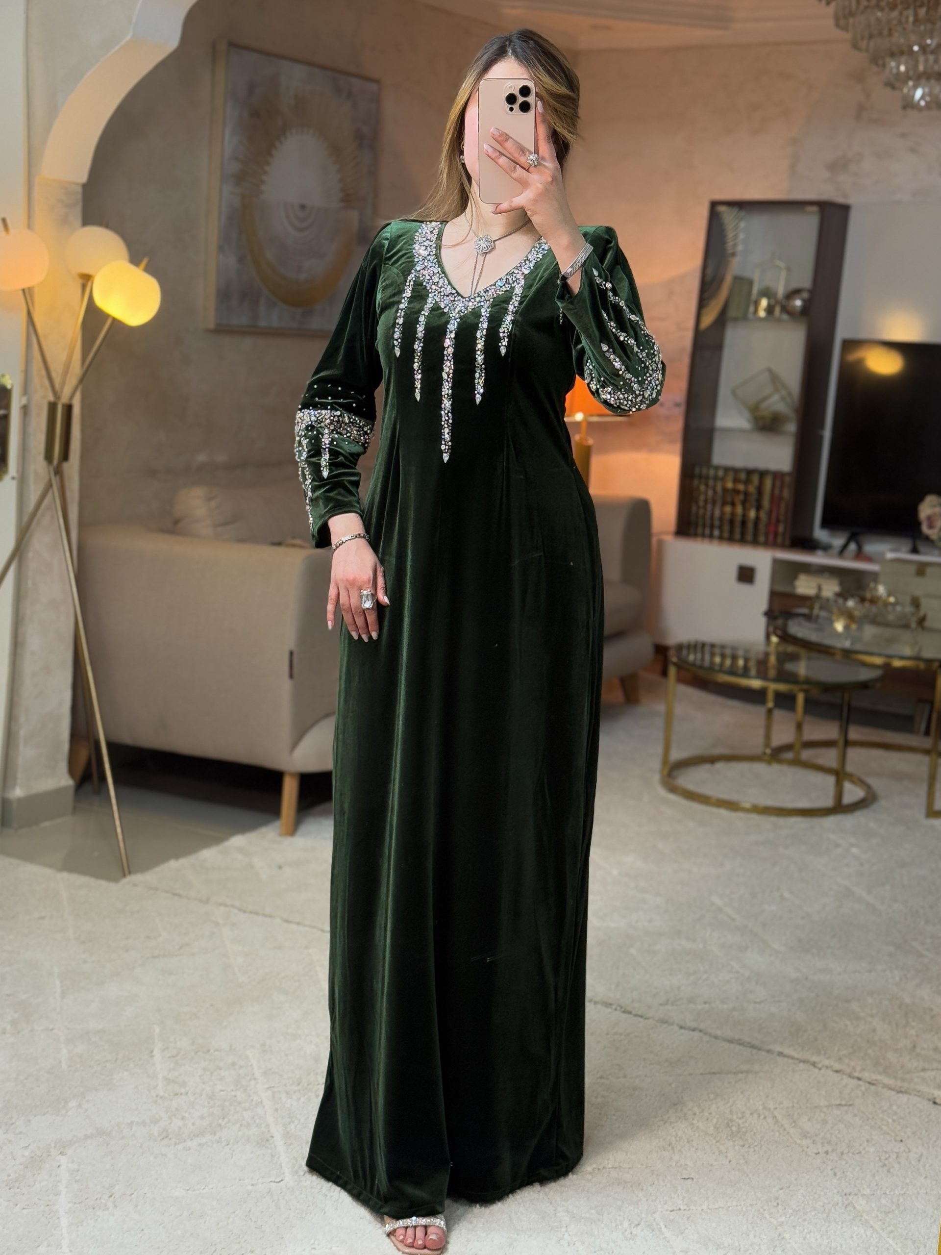 تصميم فاخر من القطيفة الراقية ، مزدان بتطريز كثيف من الأحجار اللامعة التي تنسدل من الرقبة نزولًا بشكل خطوط هندسية تزيد الإطلالة إشراقًا وأناقة.