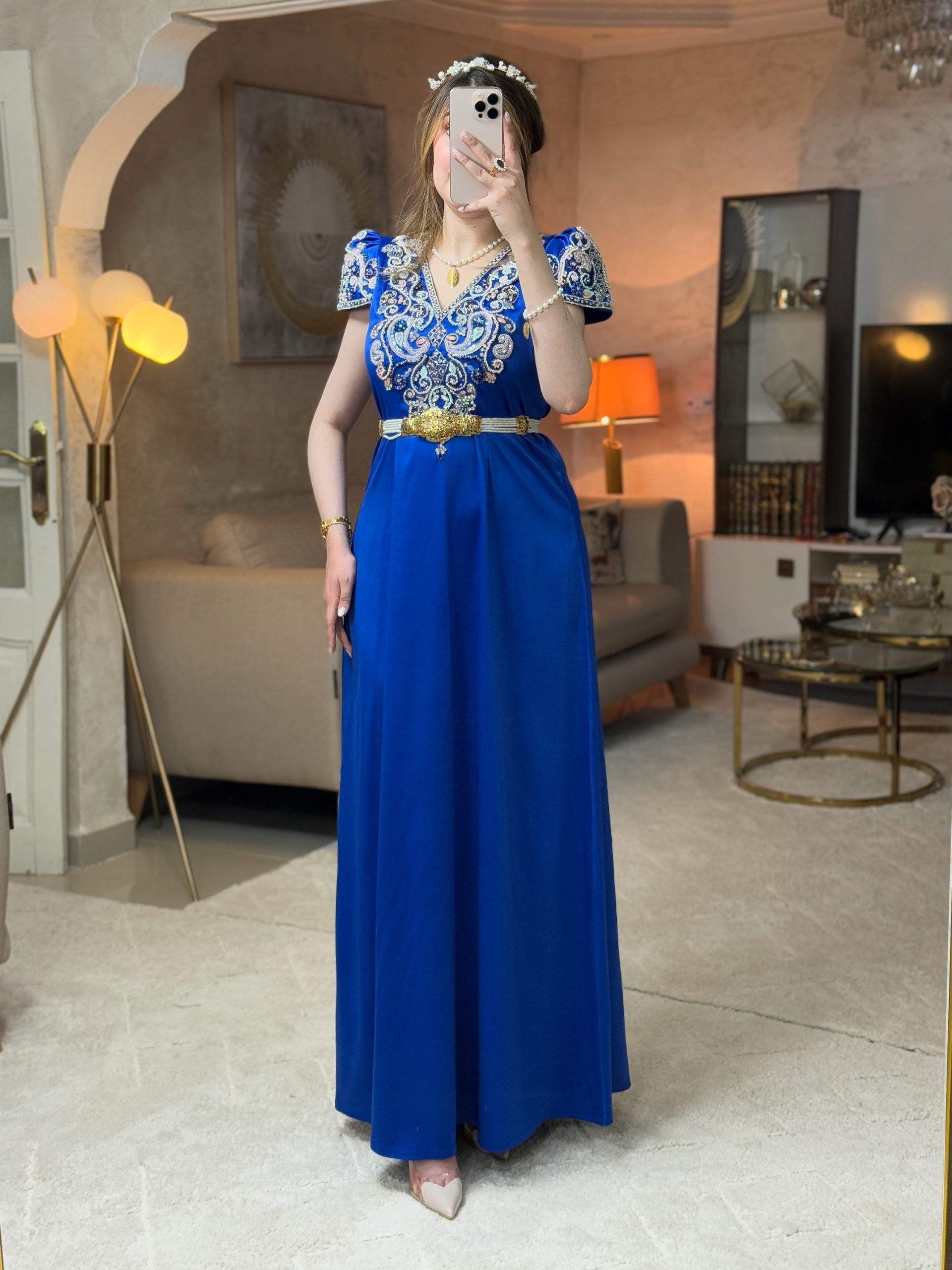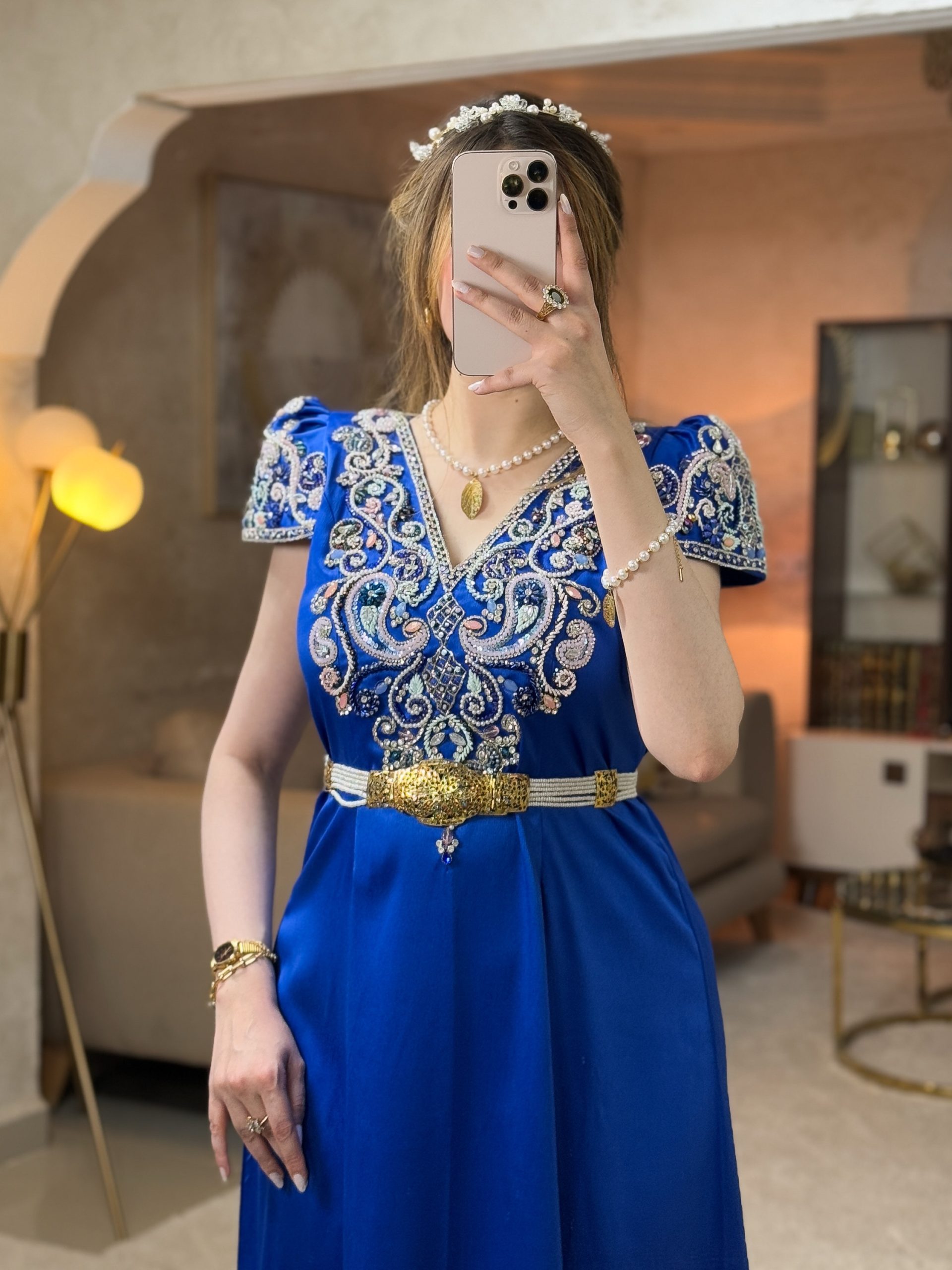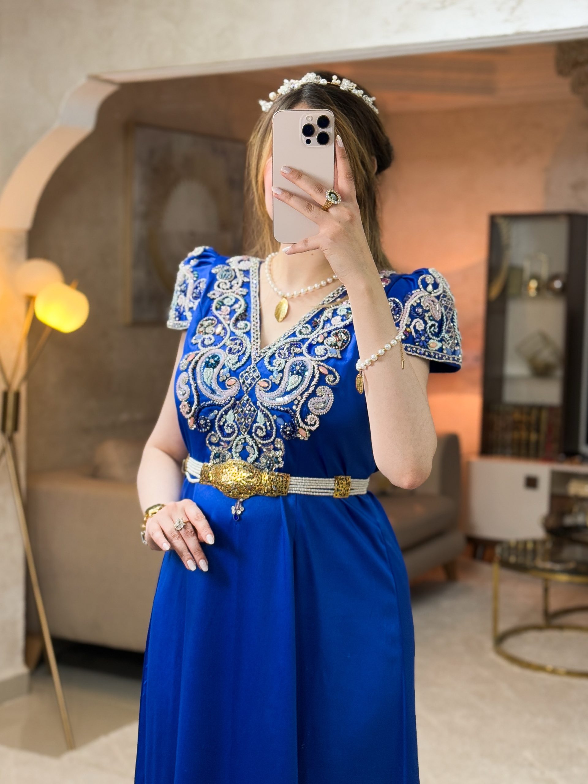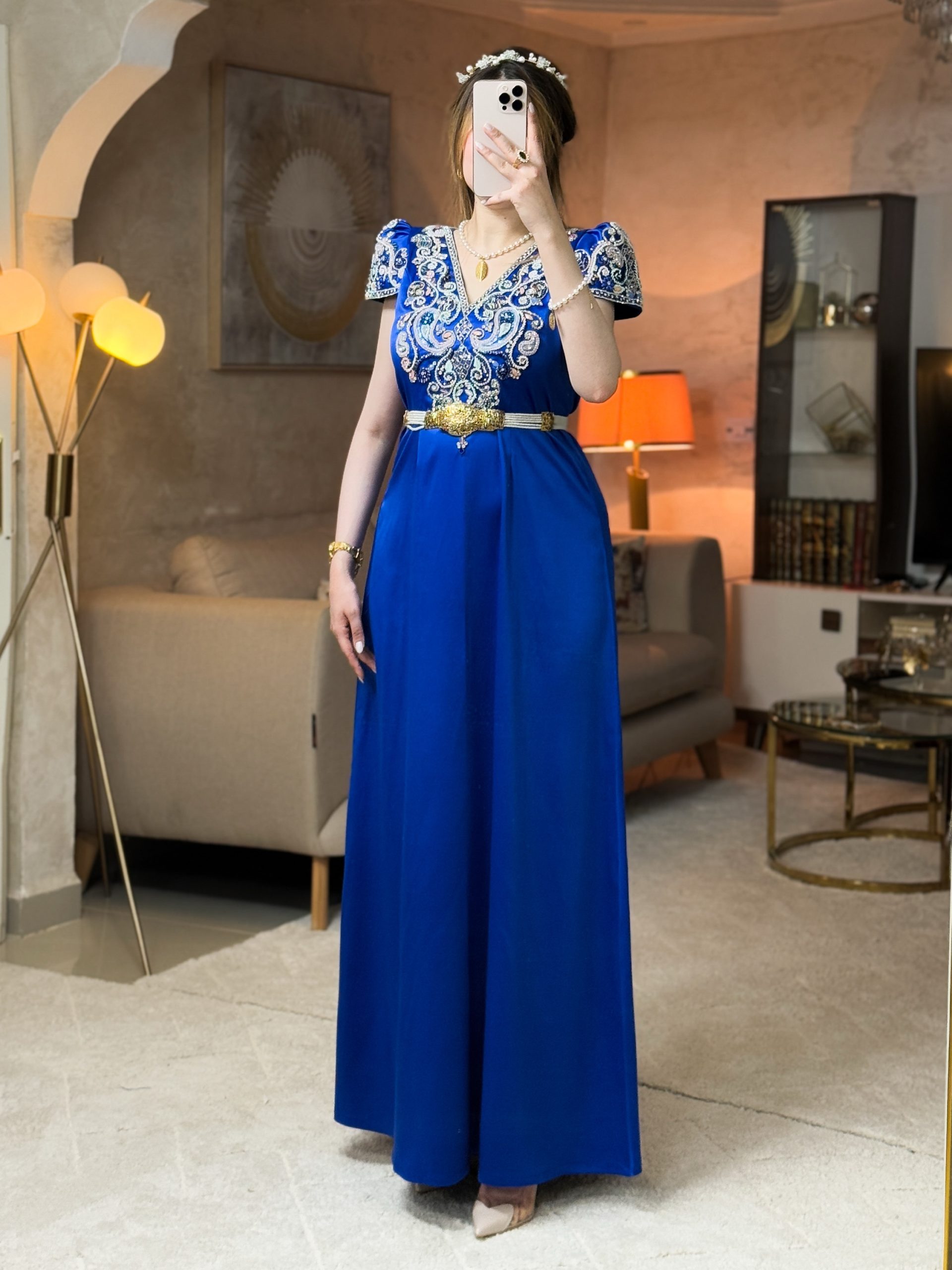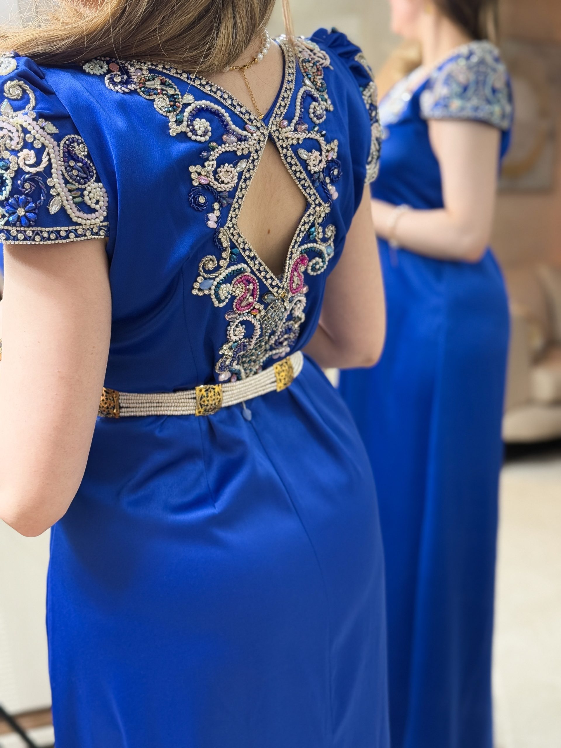 قندورة فاخرة بقصّة طويلة وانسيابية، مصنوعة من قماش ناعم ينسدل بأناقة. تتميّز بتطريز يدوي غني بالجواهر على الصدر والأكتاف، مع فتحة خلفية راقية تضيف لمسة فخامة دون مبالغة.