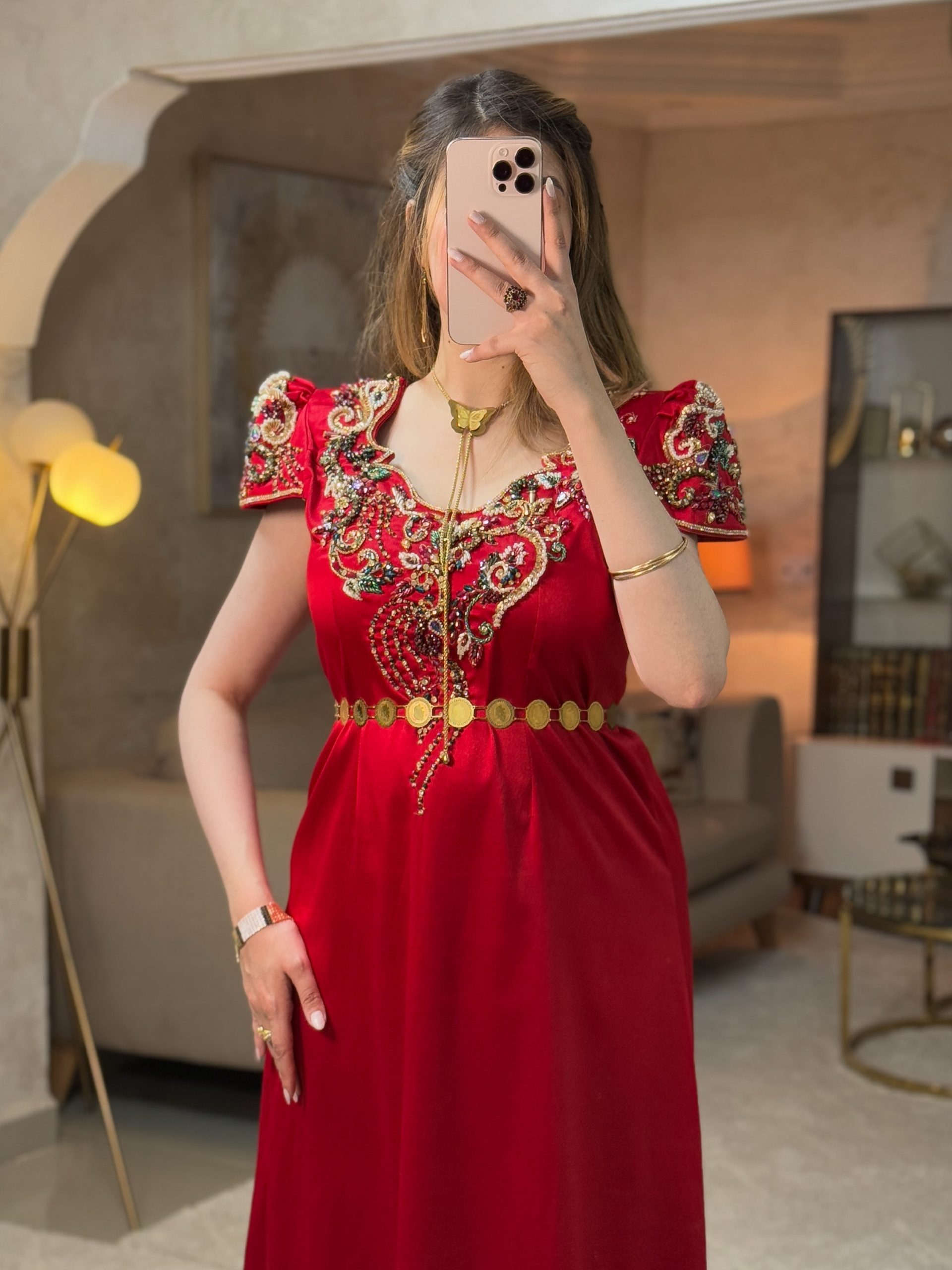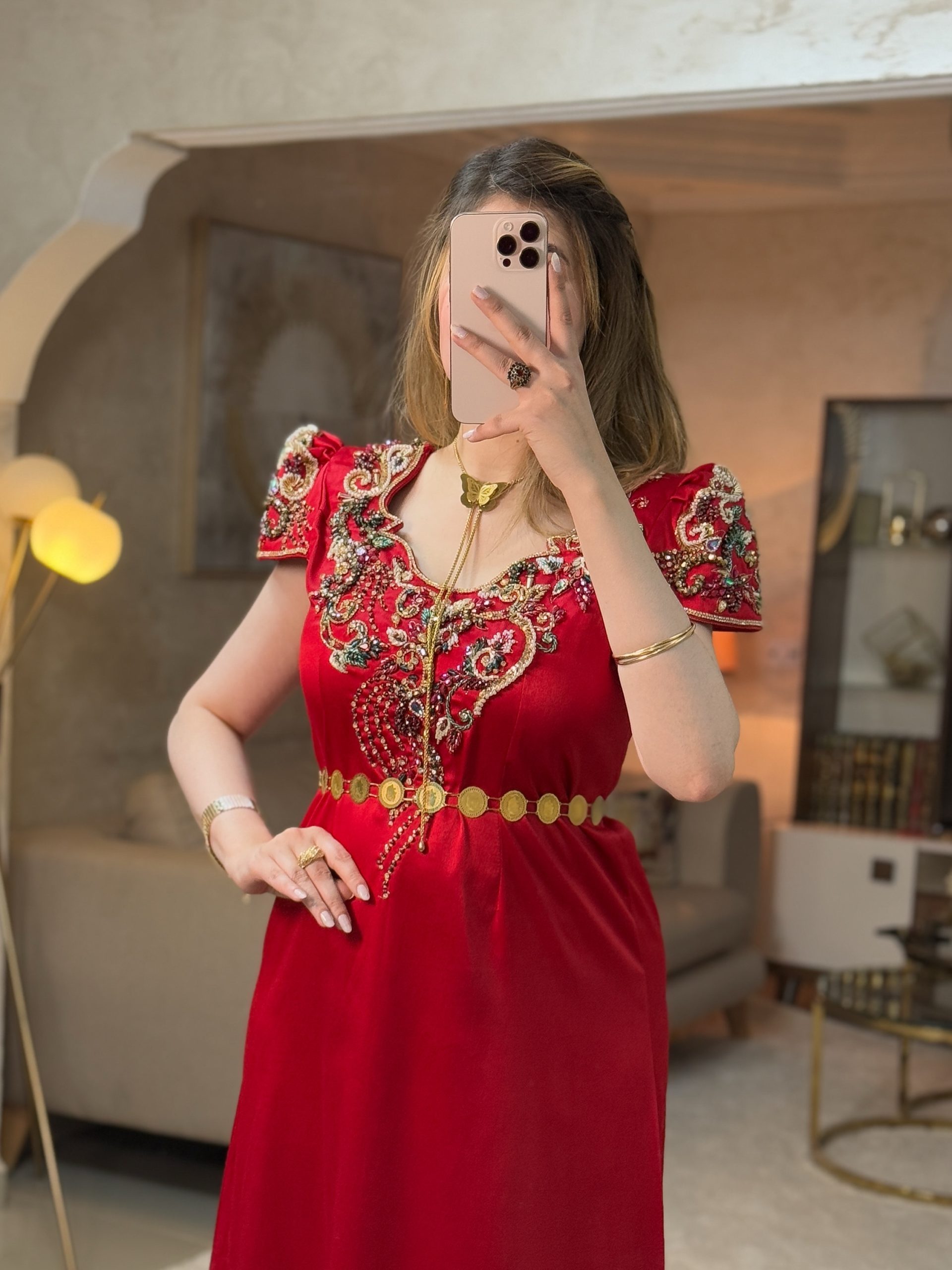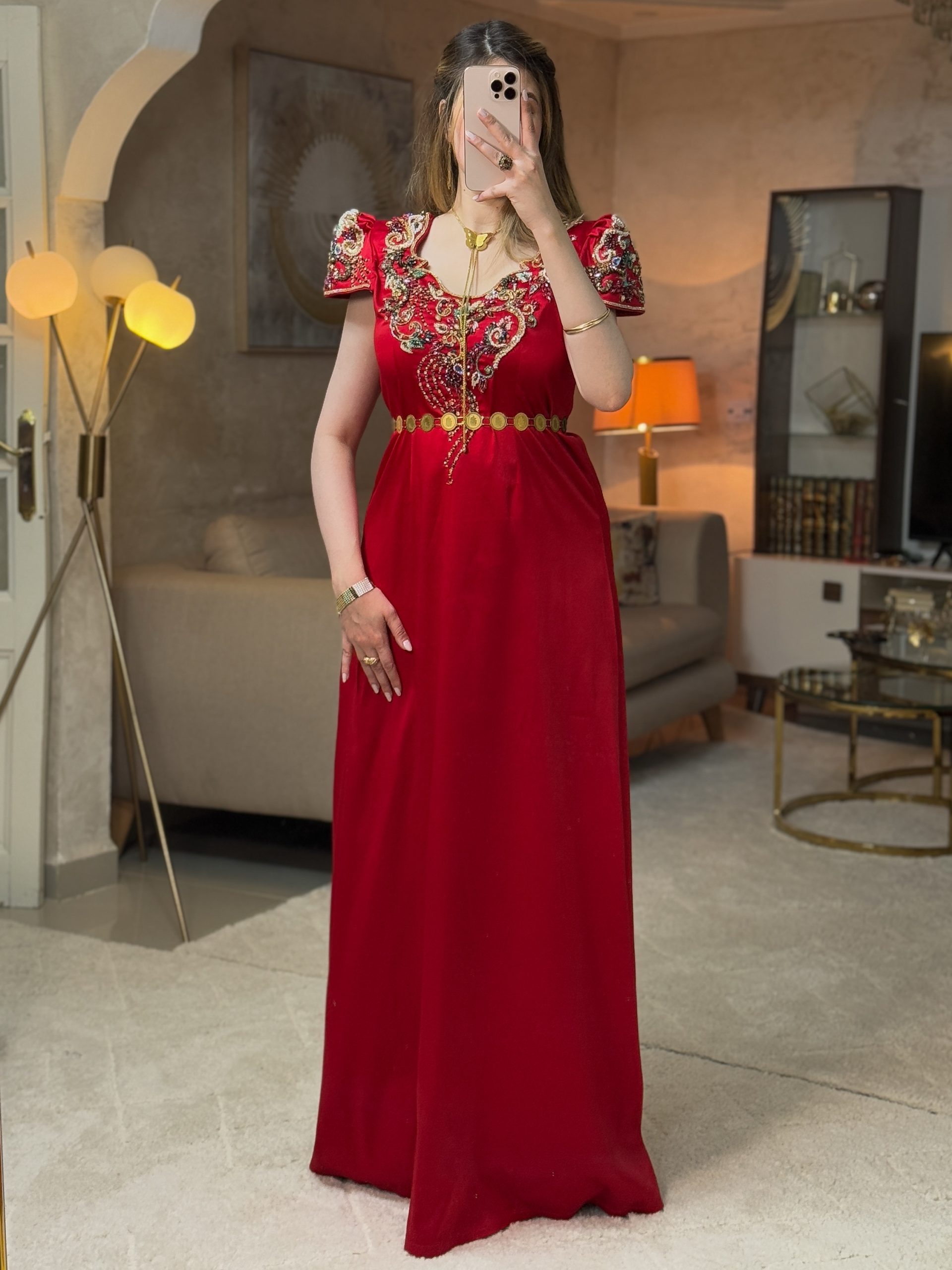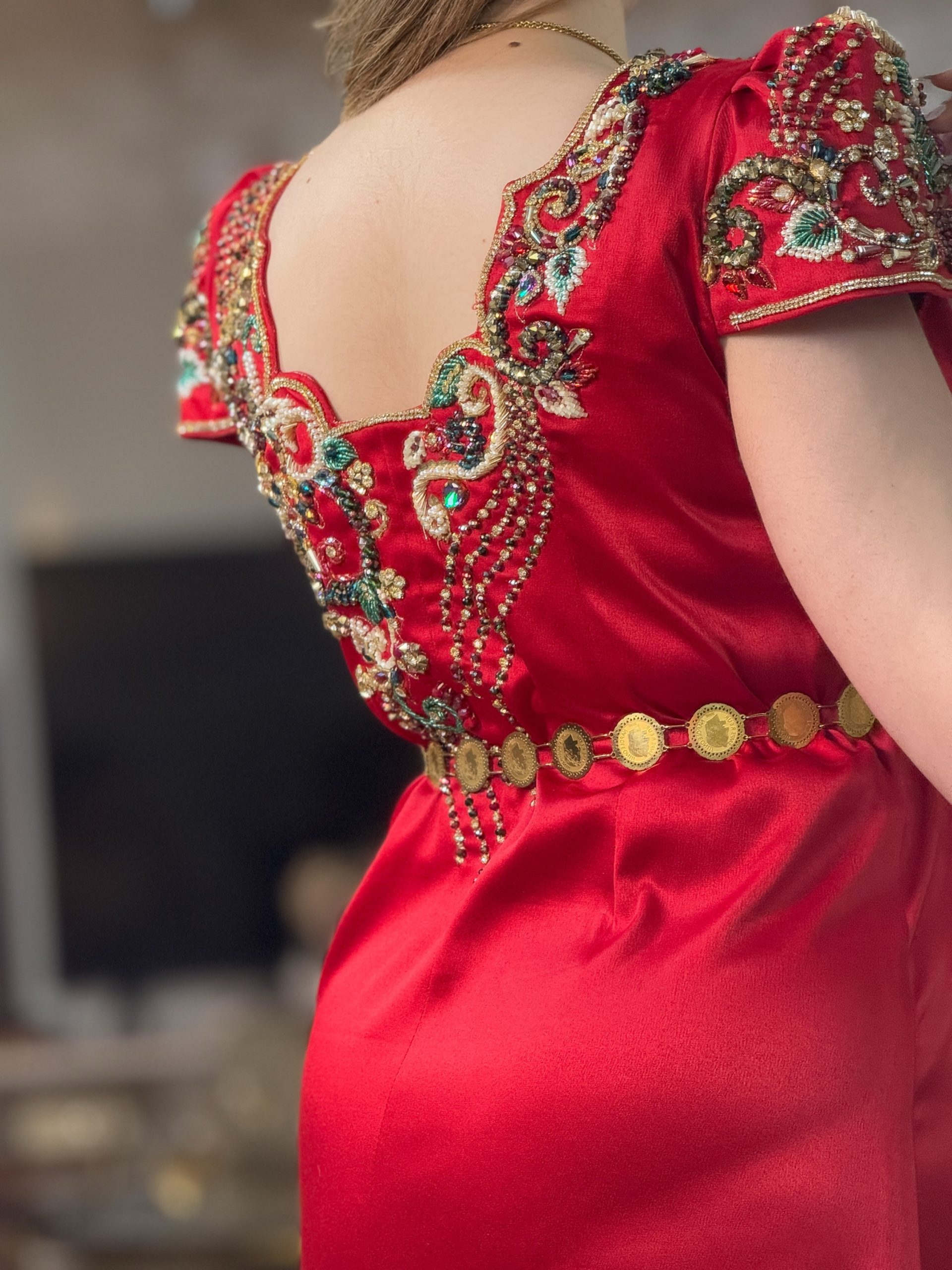 من الأمام: تطريز يدوي فاخر على الصدر والأكتاف يبرز الفستان ويمنحه لمسة فخامة، مع قصّة محدّدة أسفل الصدر تبرز القوام بنعومة.